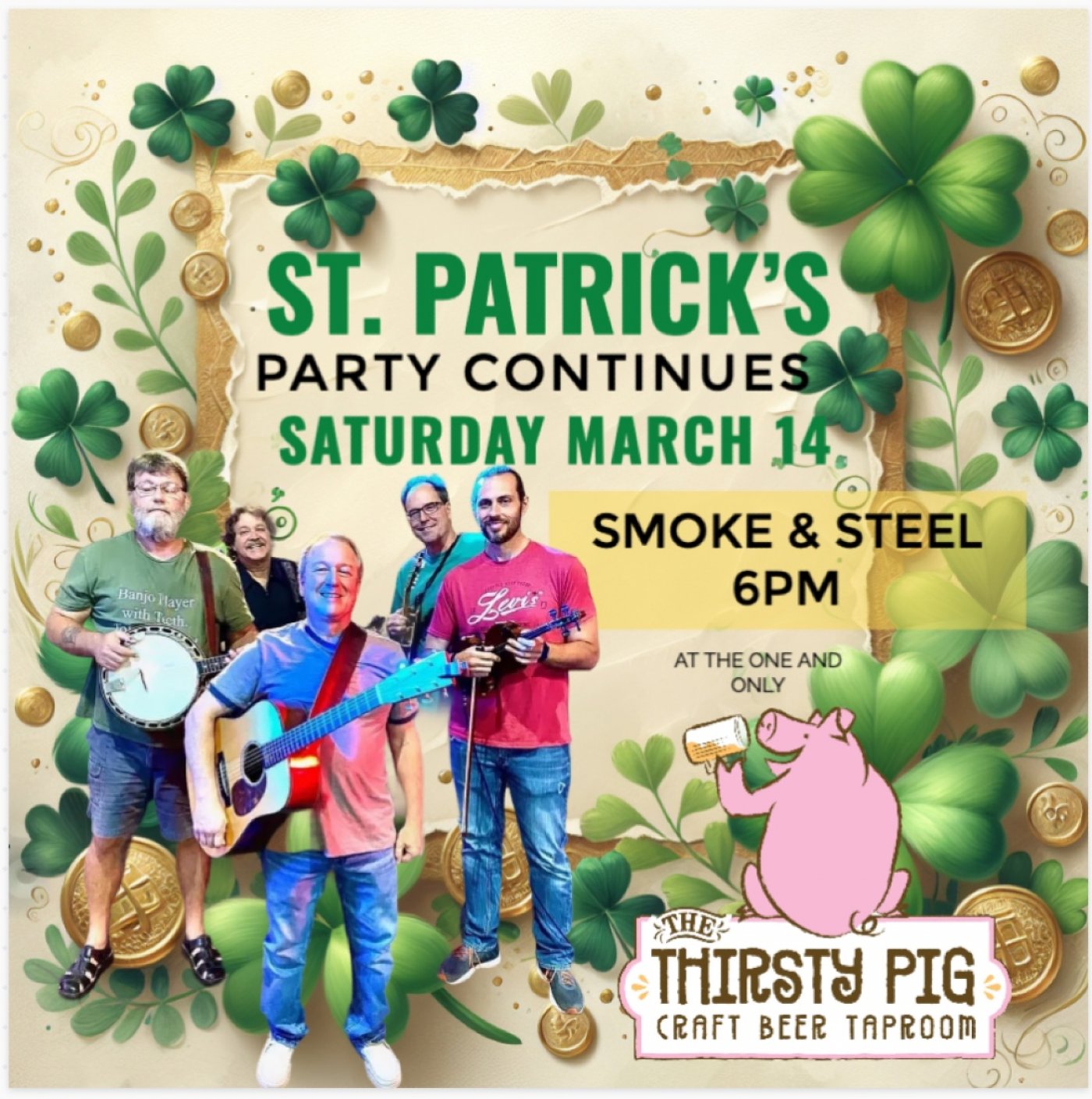 We are keeping the Saint Patricks Day festivities going tonight with bluegrass band Smoke and Steel playing the PigPen at 6PM. Fiddle player Aaron Peters also plays some Irish music so you'll get the best of all the musical styles!