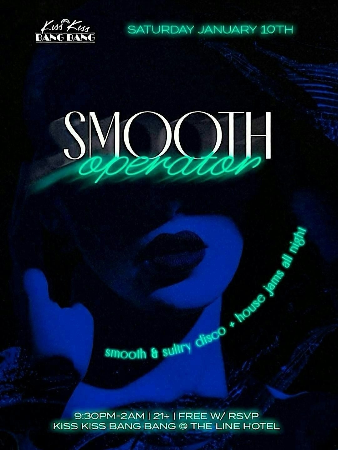 Step into the laid-back rhythm of SMOOTH OPERATOR, where mellow beats blend with disco's playful sparkle. Let smooth melodies guide you to the dance floor, and lose yourself in a fusion of serenity and spirited grooves. Join us for an evening where chic relaxation meets retro fun @ KISS KISS BANG BANG: THE LINE HOTEL | 21+