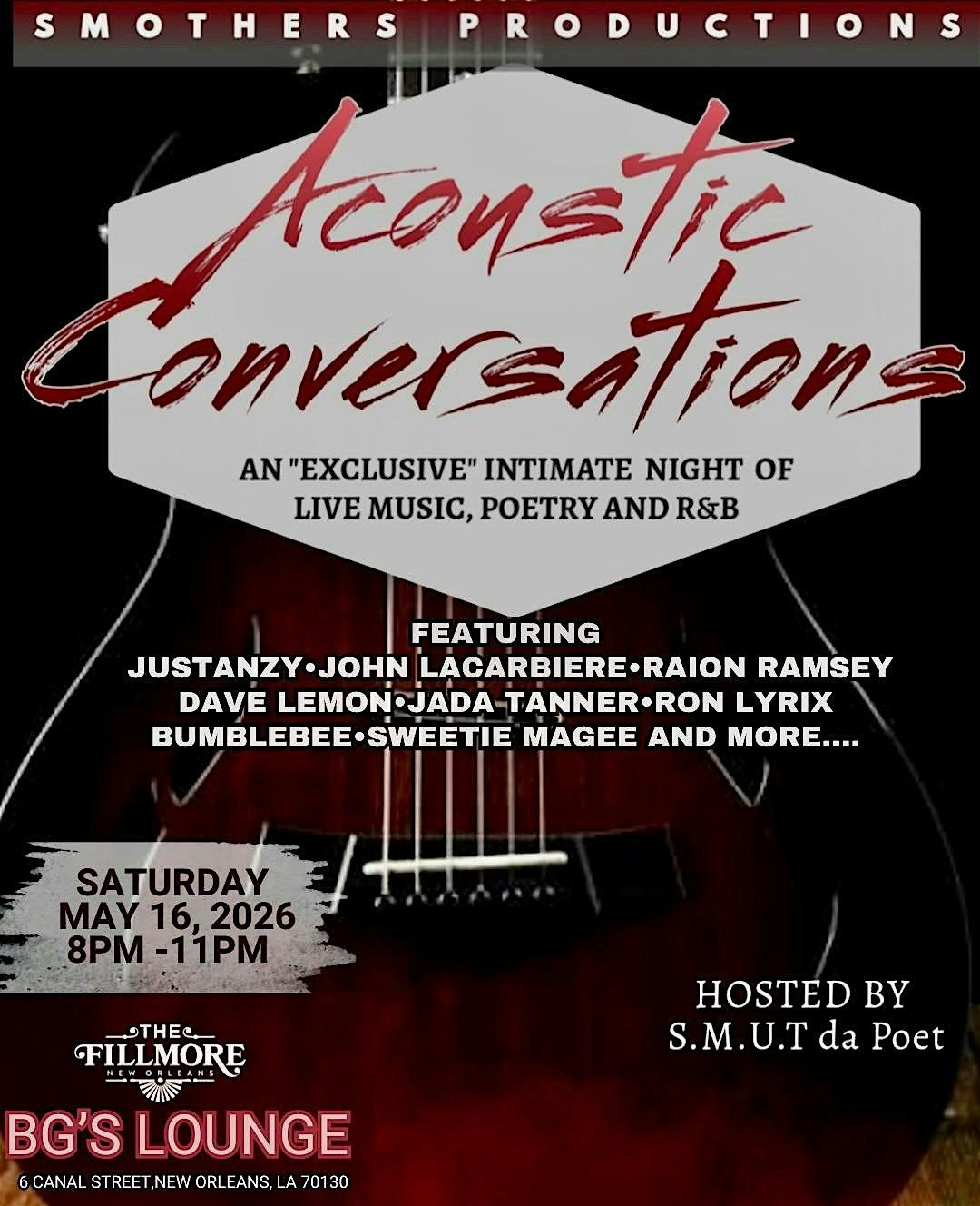 Hosted by S.M.U.T da Poet, Acoustic Conversations is more than an event it’s a safe space for expression, storytelling, and elevated vibes. Whether you're coming for the music, the poetry, or the atmosphere, this experience is designed to pull you in and leave you inspired.