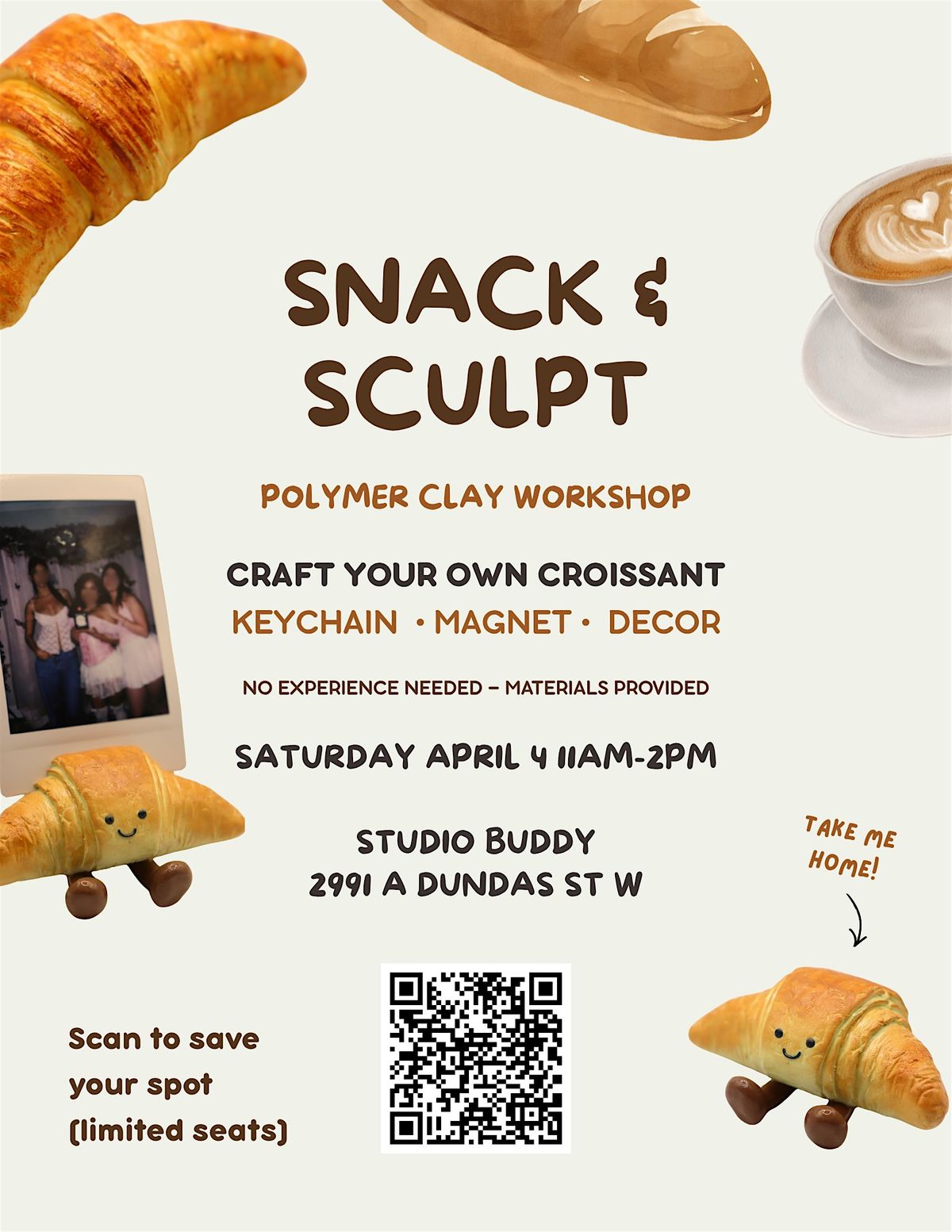 Join our Snack & Sculpt clay workshop - a cafe-inspired crafty afternoon where you can snack, relax, and create your own adorable croissant accessory.