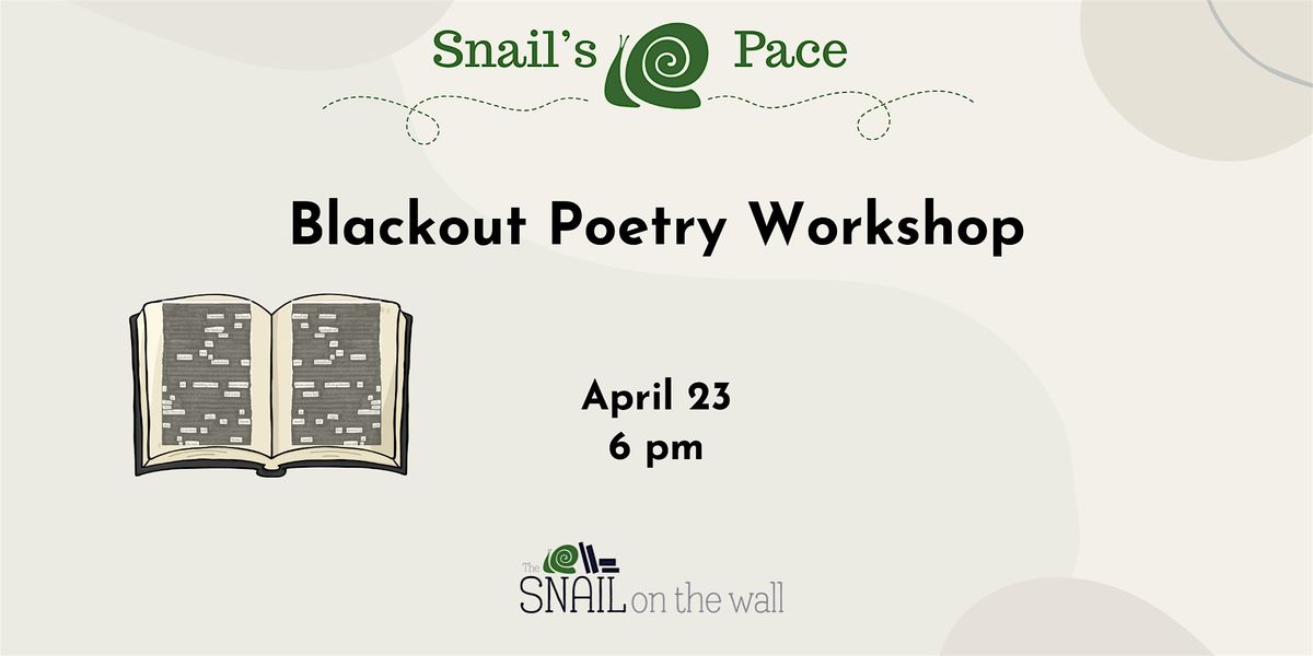 To celebrate National Poetry Month, The Snail is hosting a Blackout Poetry Workshop. Join us for a night of creativity and fun with words. All materials will be provided.