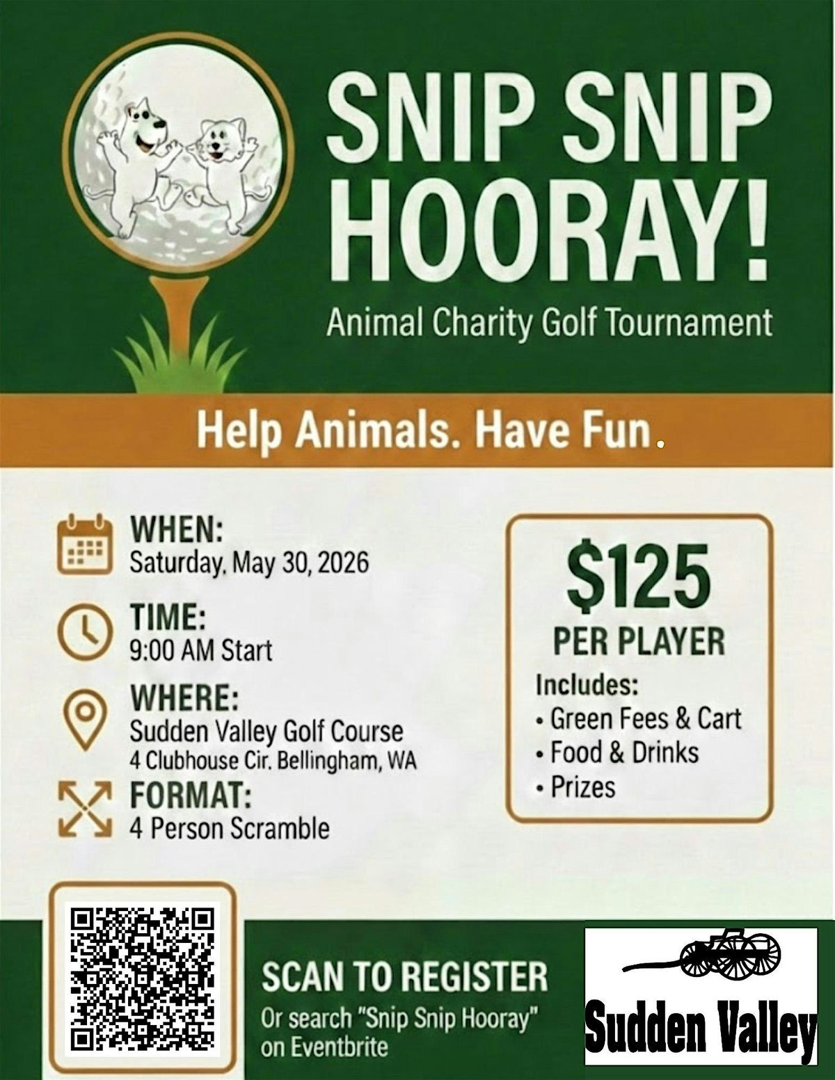 Join us at the beautiful Sudden Valley Golf Course for a day of community, competition, and compassion. Whether you’re a seasoned pro or a casual golfer, your participation directly supports Snip Snip Hooray’s mission to provide vital spay and neuter services for local animals.
