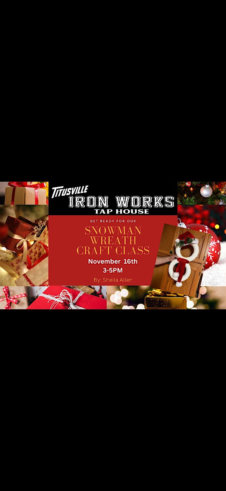 Come join us for a fun and festive snowman wreath craft class at the Titusville Iron Works Tap House! Get into the holiday spirit with this hands-on workshop where you'll learn how to create your very own adorable snowman wreath to decorate your home. No experience necessary - our instructor will guide you through each step. All materials will be provided, just bring your creativity and holiday cheer! Don't miss out on this chance to get crafty and spread some winter joy.
