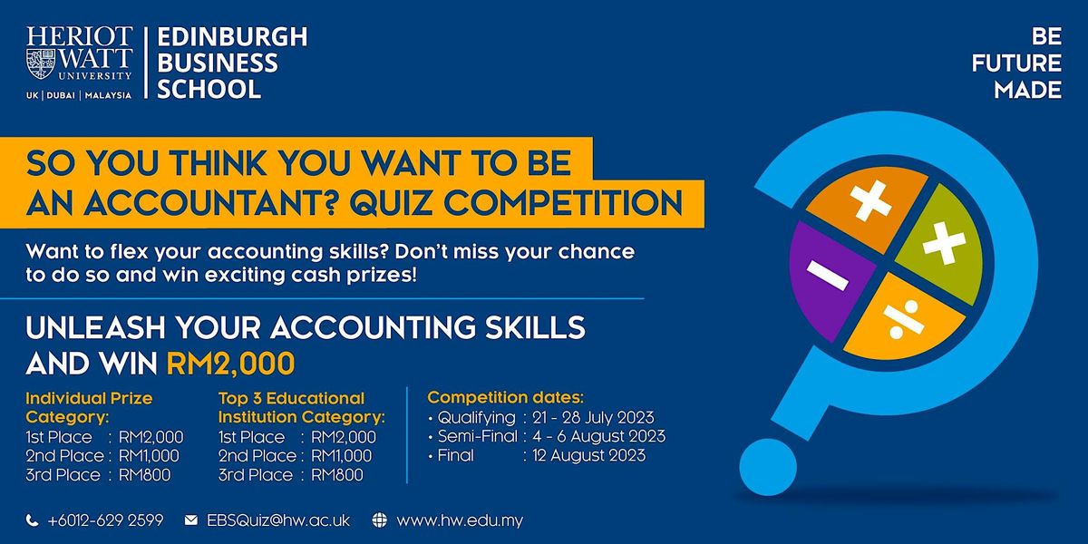 Join the Edinburgh Business School Accounting Quiz Competition 2023, organised by Heriot-Watt University Malaysia (HWUM). This exciting competition is open to all Form 5 students in public or private schools and Year 11 students in international schools in Malaysia. No registration fees are required.