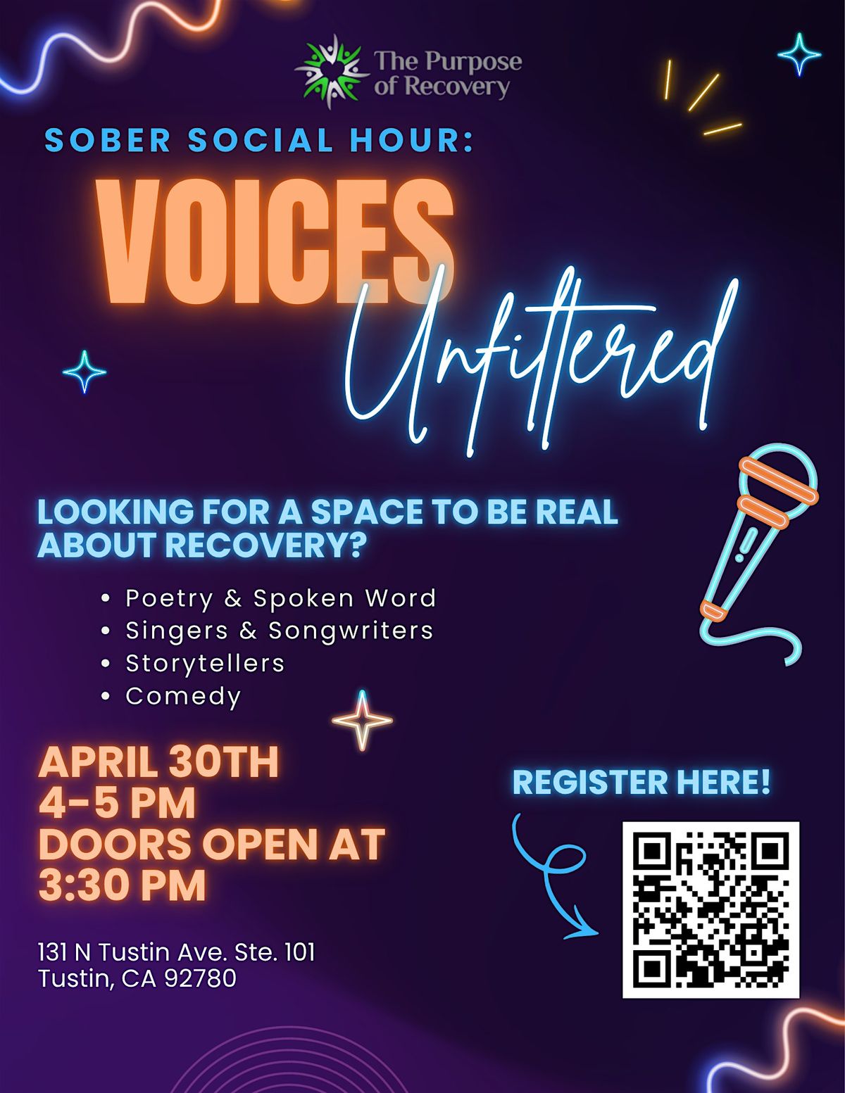 Join us on April 30th for our 3rd Sober Social Hour event. Voices Unfiltered is an open mic-style space for real stories!