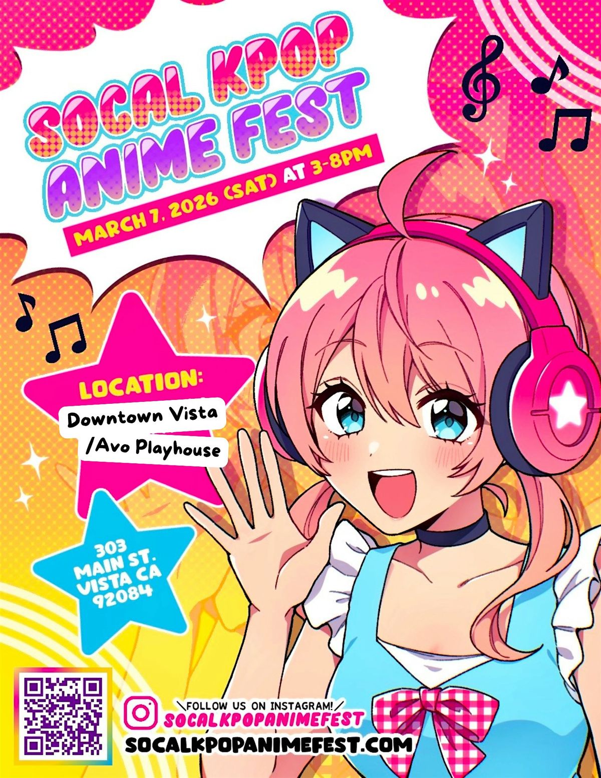 Get ready for the ultimate combo of Kpop beats and anime vibes! SoCal Kpop Anime Fest is your go-to spot to vibe with fellow fans, enjoy live performances, Kpop Demon Hunter activities, kpop freebies , cosplay contests, and so much more—all happening in person, FREE EVENT! Right in the awesome Downtown Vista, CA. Don’t miss out on the fun and epic memories and meeting more pop culture friends!
