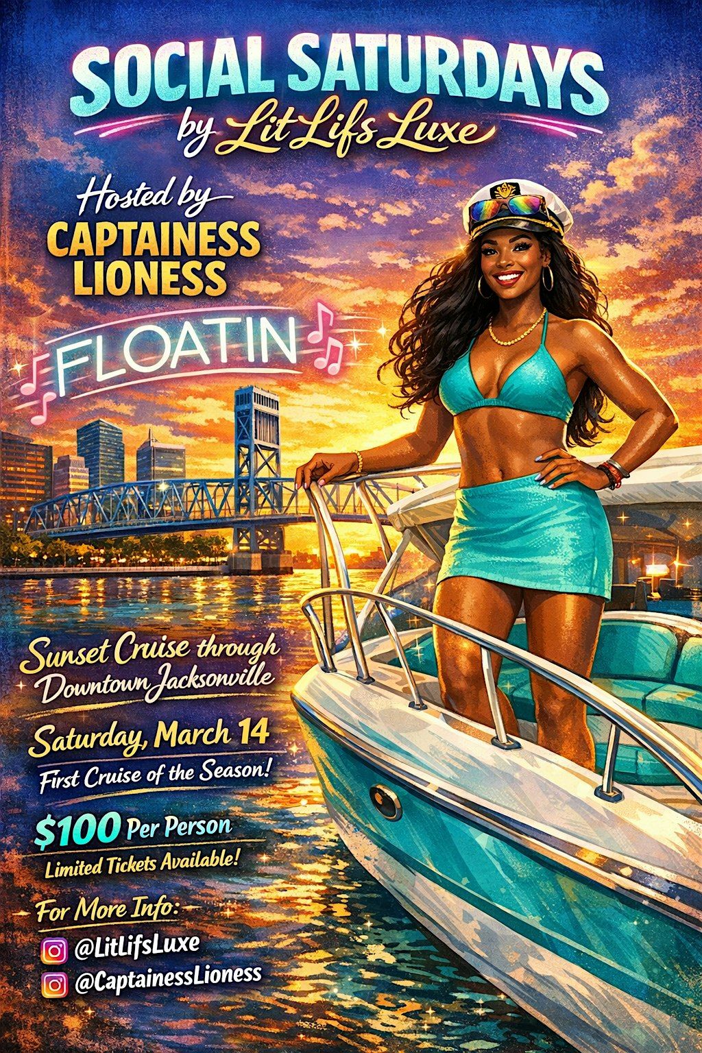 Social Saturdays is a chic 2-hour sunset yacht experience hosted by Captainess Lioness on the beautiful St. Johns River in Jacksonville. Guests will be offered a complimentary glass of champagne as they enjoy stunning sunset views from the water.