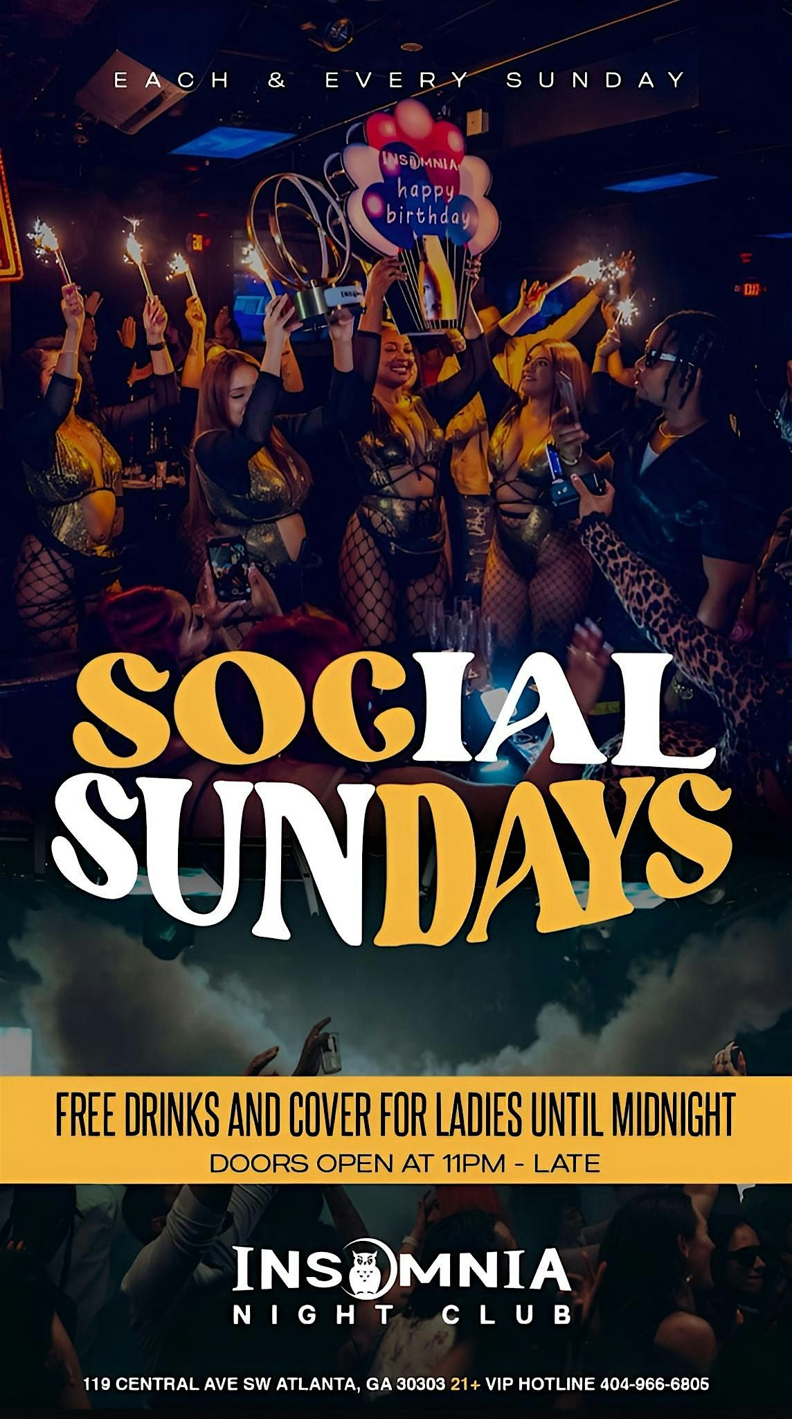 End the weekend strong at Social Sundays! Ladies enjoy FREE cover and drinks until 12 AM. The ultimate Atlanta Sunday night reset. 11 PM.