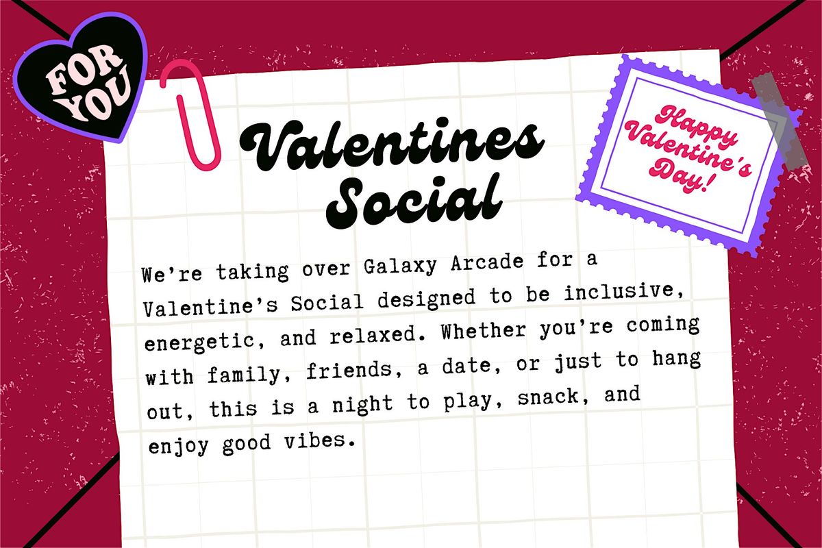 We’re taking over Galaxy Arcade for a Valentine’s Social designed to be inclusive, energetic, and relaxed. Whether you’re coming with family, friends, a date, or just to hang out, this is a night to play, snack, and enjoy good vibes.