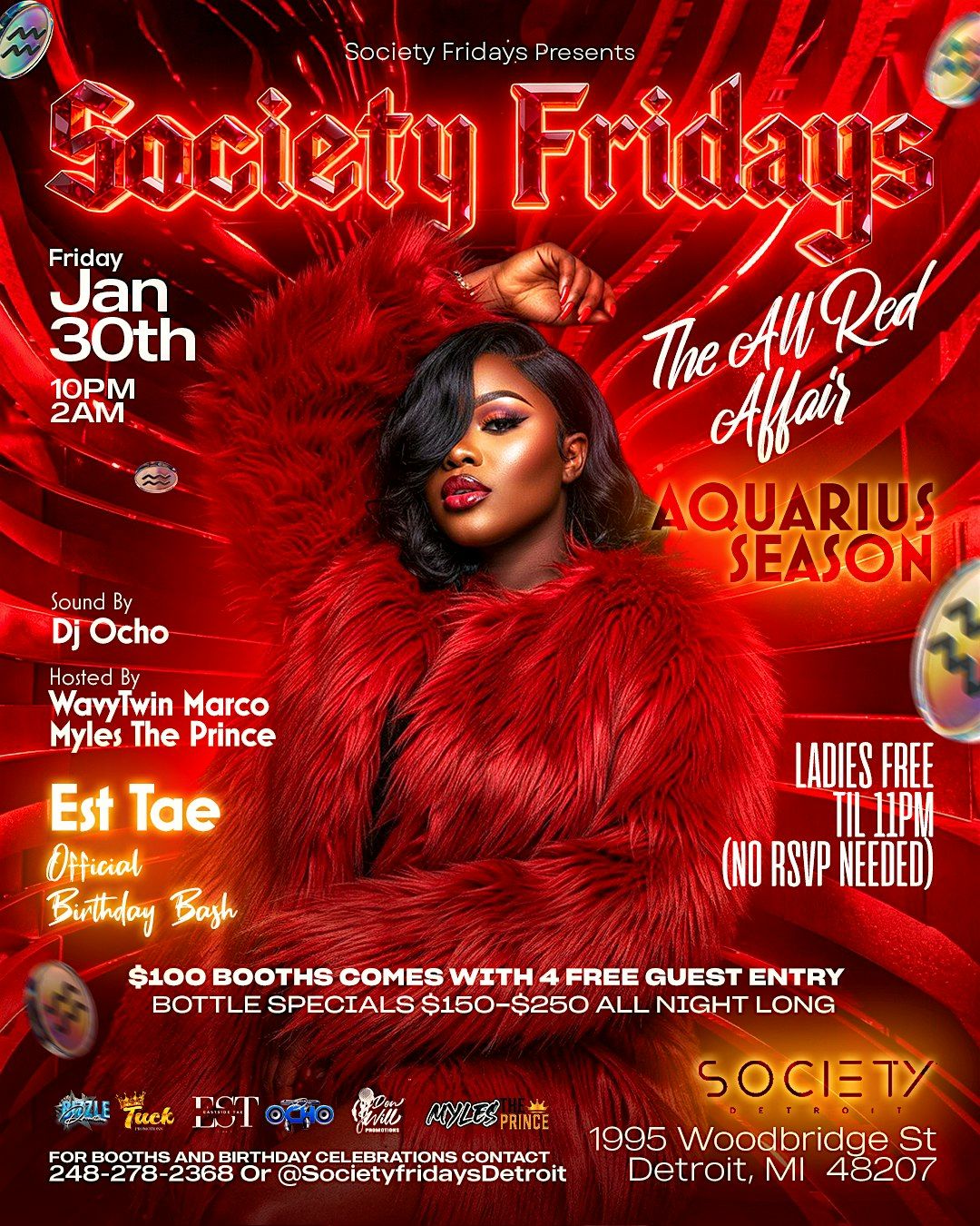 Welcome to Society Friday (All Red Affair) happening at Society Detroit on Jan 30th, 2026 at 10:00 pM (Eastern Time)! Get ready to dress in your best red outfit and join us for a night of fun and excitement. Let's paint the town red together at this exclusive event. Don't miss out on the opportunity to socialize, dance, and make unforgettable memories. See you there!