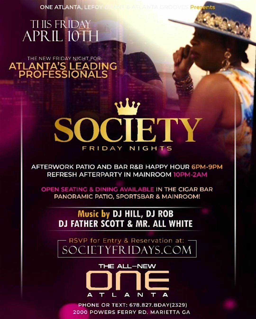 🎉 SOCIETY FRIDAY each and every Friday night, come experience our special twist for Fridays with an upscale, high-energy nightlife version curated for Atlanta’s professional, stylish, and socialite crowd. Hosted at the ALL-NEW ONE ATLANTA LOUNGE, this all new venue and night sets the tone for what will quickly become one of the city’s most talked-about Friday nights.