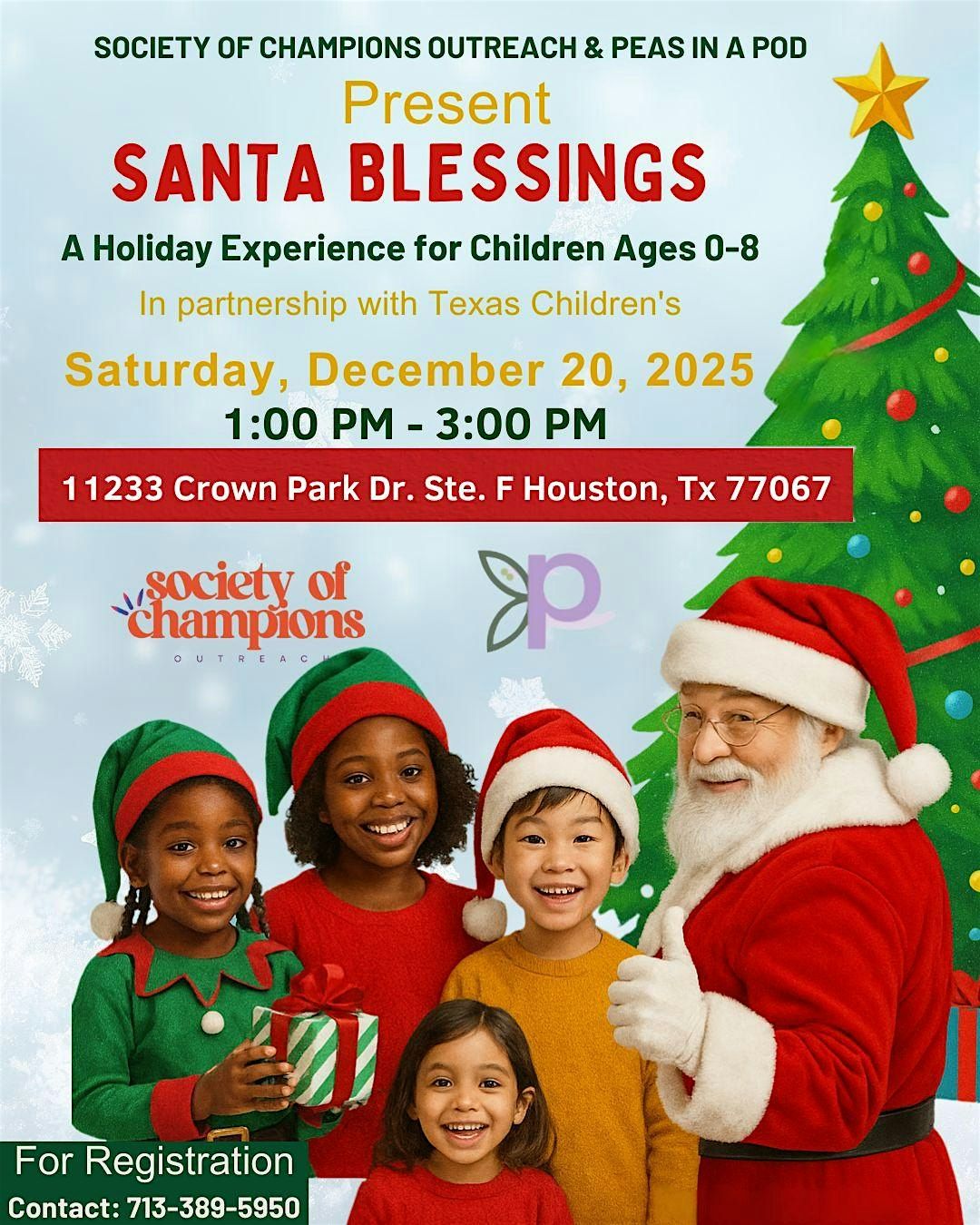 Get ready for a festive, fun-filled day in person! Join us as the Society of Champions , Peas in A Pod team up with Texas Children to bring you Santa Blessings. It’s all about good vibes, great company, and holiday cheer. Don’t miss out on the chance to celebrate the season together and make some magical memories. This event is for children 0 - 8 years old.