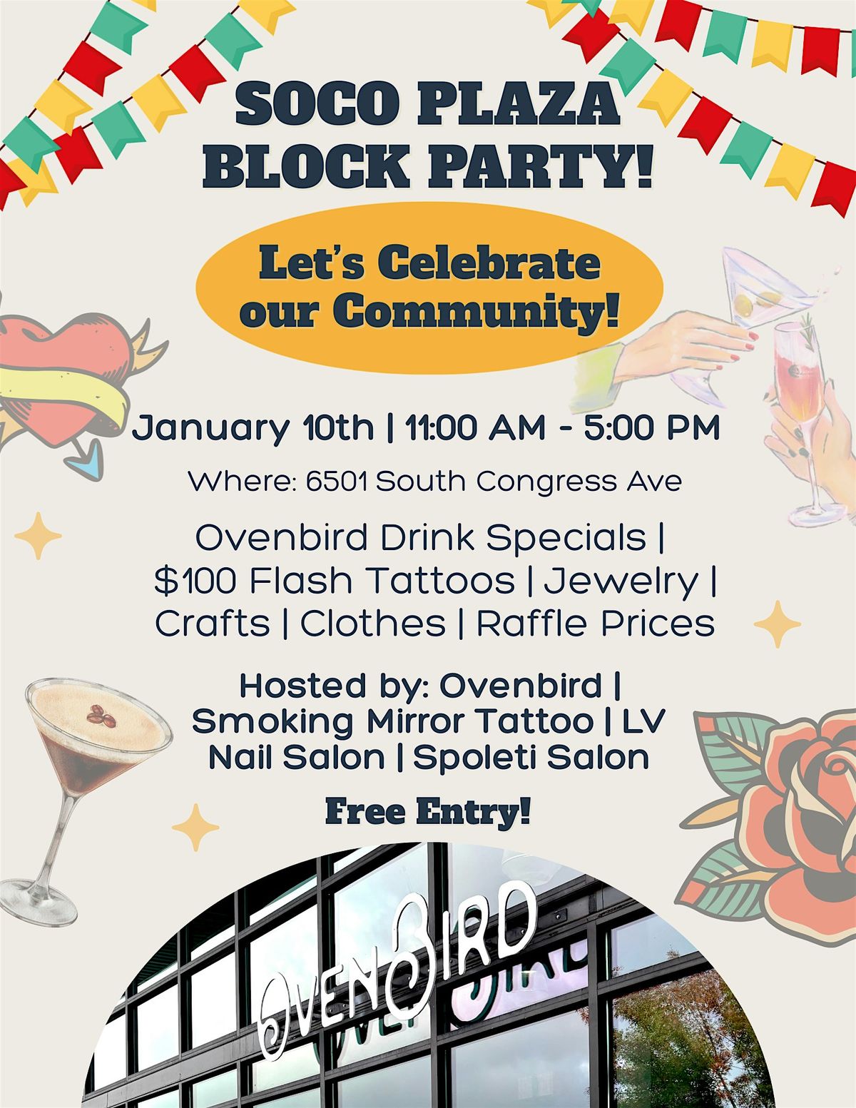 Welcome to our first annual SoCo Plaza Block Party! We will have local art/craft vendors, Ovenbird drink specials, $100 Flash Tattoo by Smoking Mirrors Tattoo and a fun raffle with great prizes! Free entry!