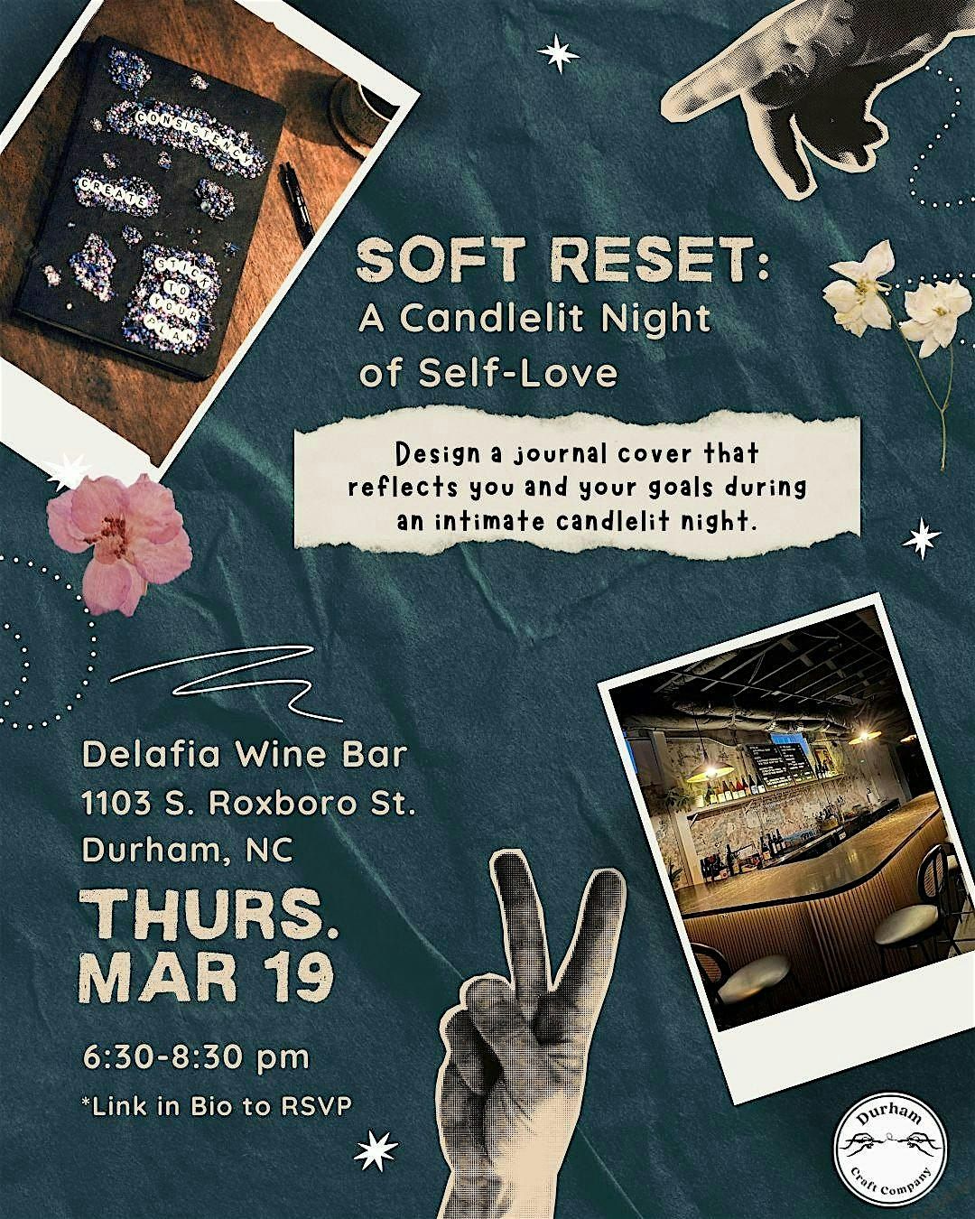 Soft Reset is a low-key, adult craft night centered on self-care, reflection, and creativity. We’ll gather around a candlelit communal table to design a custom journal cover and create a personal reset page you can return to again and again.