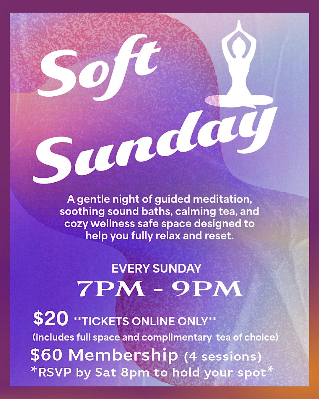 Soft Sunday is your weekly invitation to slow down and reset. Join us for a calming evening of guided meditation, immersive sound baths, warm tea, and cozy wellness cushions designed for deep relaxation and restoration.