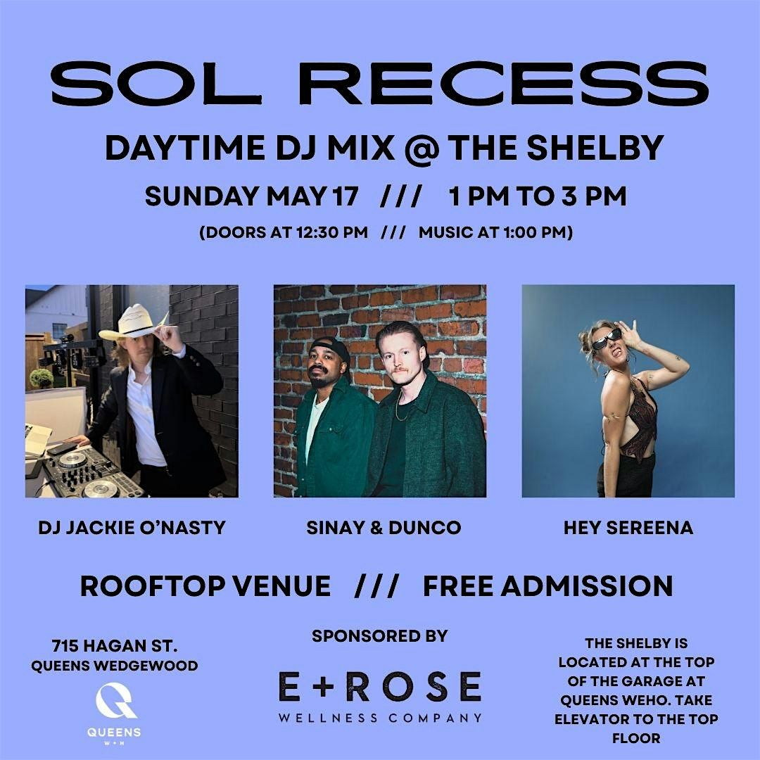 SOL RECESS is a Daytime Rooftop DJ Mix at The Shelby (Rooftop of 715 Hagan St). Sunday May 17th. Doors open at 12:30pm and music goes from 1:00 pm to 3:00 pm. FREE ADMISSION. The Shelby is located at the top of the garage at Queens Wedgewood Houston. Take the elevator in the garage to the top floor. Featuring DJ acts: Sinay & Dunco, Hey Sereena and DJ Jackie O'Nasty. A special thanks to our sponsor E+Rose Wellness Company. Come out and vibe!