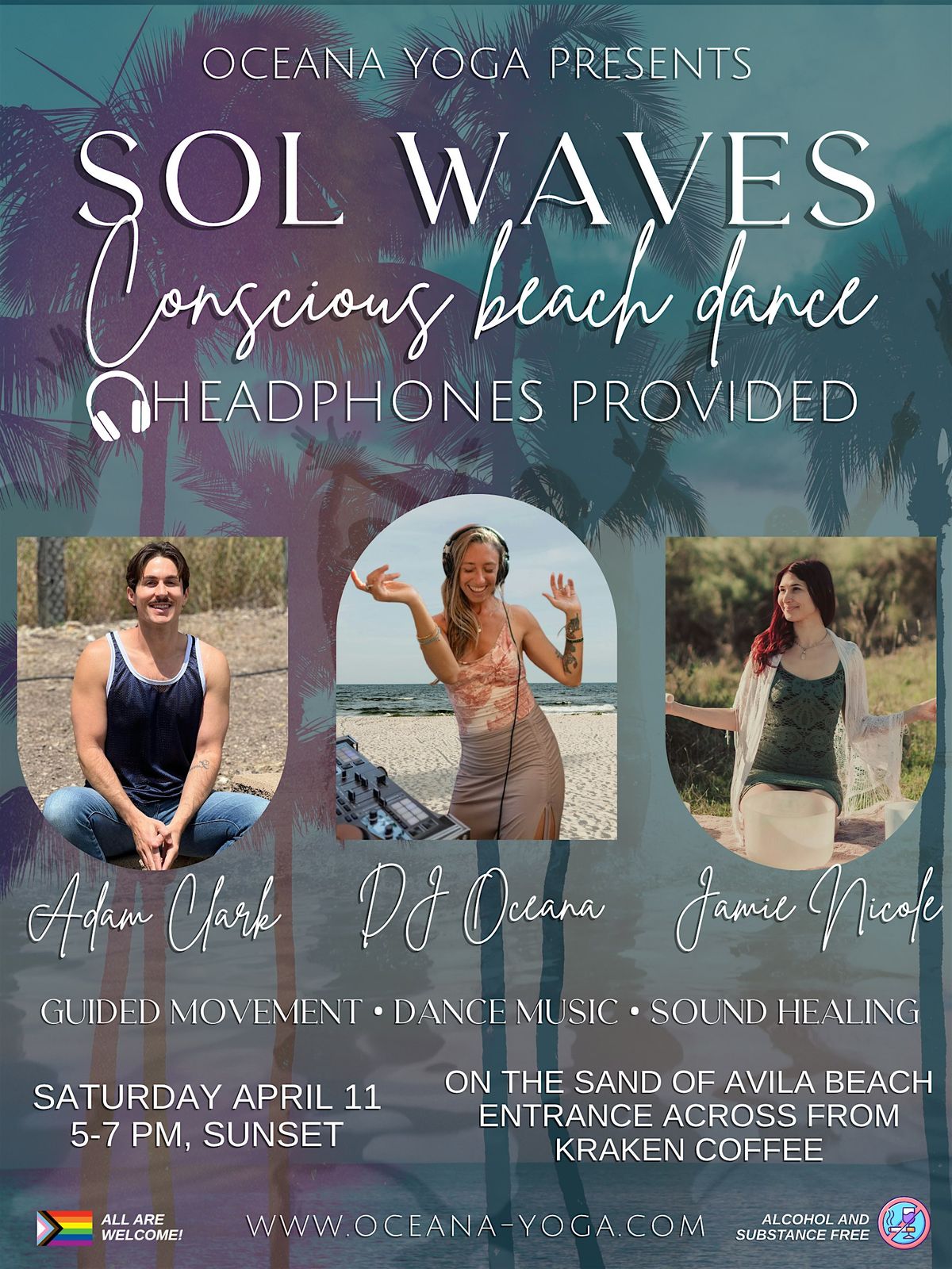 Sol Waves by Oceana Yoga is a conscious beach dance experience guided by embodied movement, curated dance music, and sound healing — all held in silent-disco style with headphones provided.