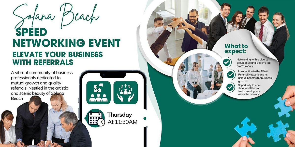 Discover the power of networking in Solana Beach with the TEAM Referral Network, a vibrant community of business professionals dedicated to mutual growth and quality referrals. Nestled in the artistic and scenic beauty of Solana Beach, this event invites entrepreneurs and business owners from a variety of fields—including health and wellness, real estate, legal services, and more—to connect, collaborate, and expand their reach.