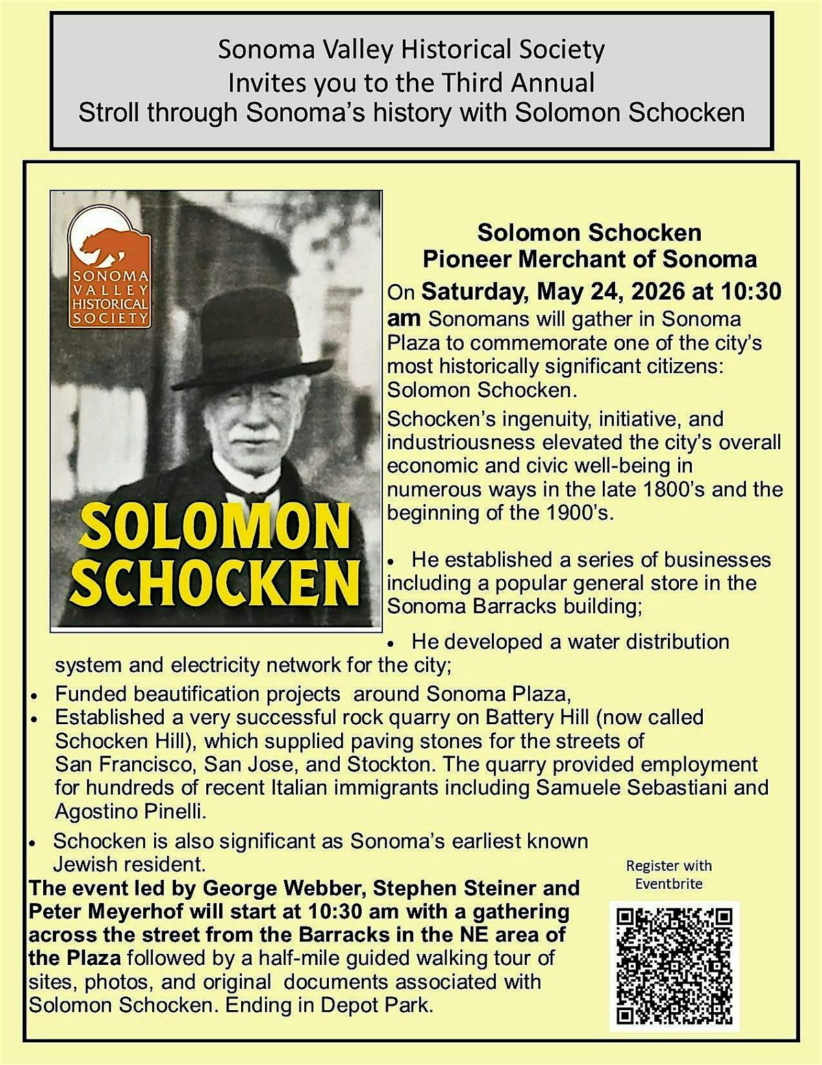 He established a series of businesses including a popular general store in the Sonoma Barracks building; · He developed a water distribution system and electricity network for the city; He funded beautification projects around Sonoma Plaza, and · He established a very successful rock quarry on Battery Hill (now called Schocken Hill), which supplied paving stones for the streets of San Francisco, San Jose, and Stockton. The quarry provided employment for hundreds of recent Italian immigrants including Samuele Sebastiani and Agostino Pinelli. · Schocken is also significant as Sonoma’s earliest known Jewish resident. The event led by George Webber and Peter Meyerhof will start at 10:30 am with a gathering at the Bear Flag Statue in the NE area of the Plaza followed by a half-mile guided walking tour of sites, photos, and original documents associated with Solomon Schocken.