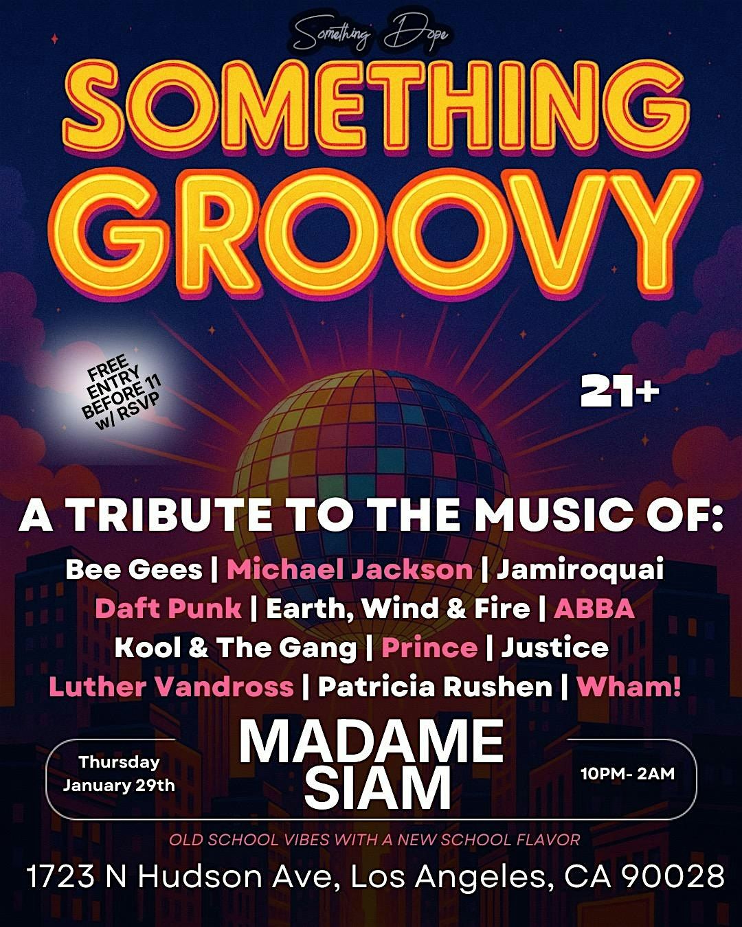Something Groovy, presented by Something Groovy & Ledisko, is a late-night dancefloor tribute to the timeless sounds that shaped generations. From the smooth soul of Luther Vandross and Patrice Rushen to the electric grooves of Michael Jackson, Prince, Earth, Wind & Fire, Daft Punk, ABBA, and more this night blends disco, funk, soul, and dance classics with a fresh, modern edge. Join us at Madame Siam for old-school vibes with a new-school flavor, where the energy is high, the records are legendary, and the dance floor stays moving all night long. Free entry before 11pm with RSVP. 21+ only.