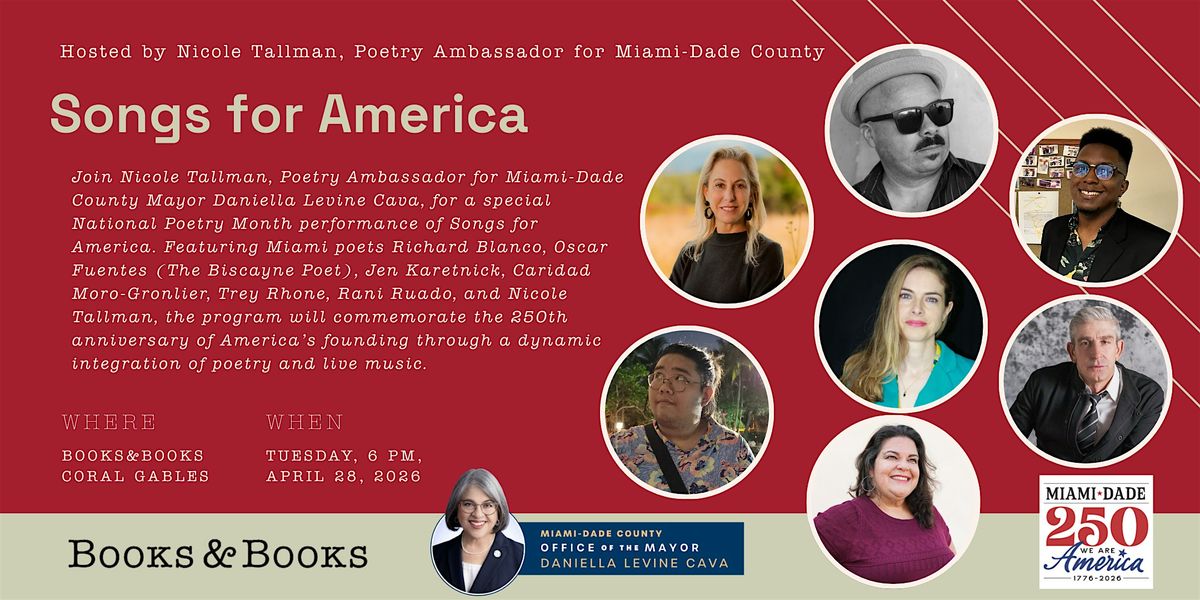 Join Nicole Tallman, Poetry Ambassador for Miami-Dade County Mayor Daniella Levine Cava, for a special National Poetry Month performance of Songs for America. Featuring Miami poets Richard Blanco, Oscar Fuentes (The Biscayne Poet), Jen Karetnick, Caridad Moro-Gronlier, Trey Rhone, Rani Ruado, and Nicole Tallman, the program will commemorate the 250th anniversary of America’s founding through a dynamic integration of poetry and live music.