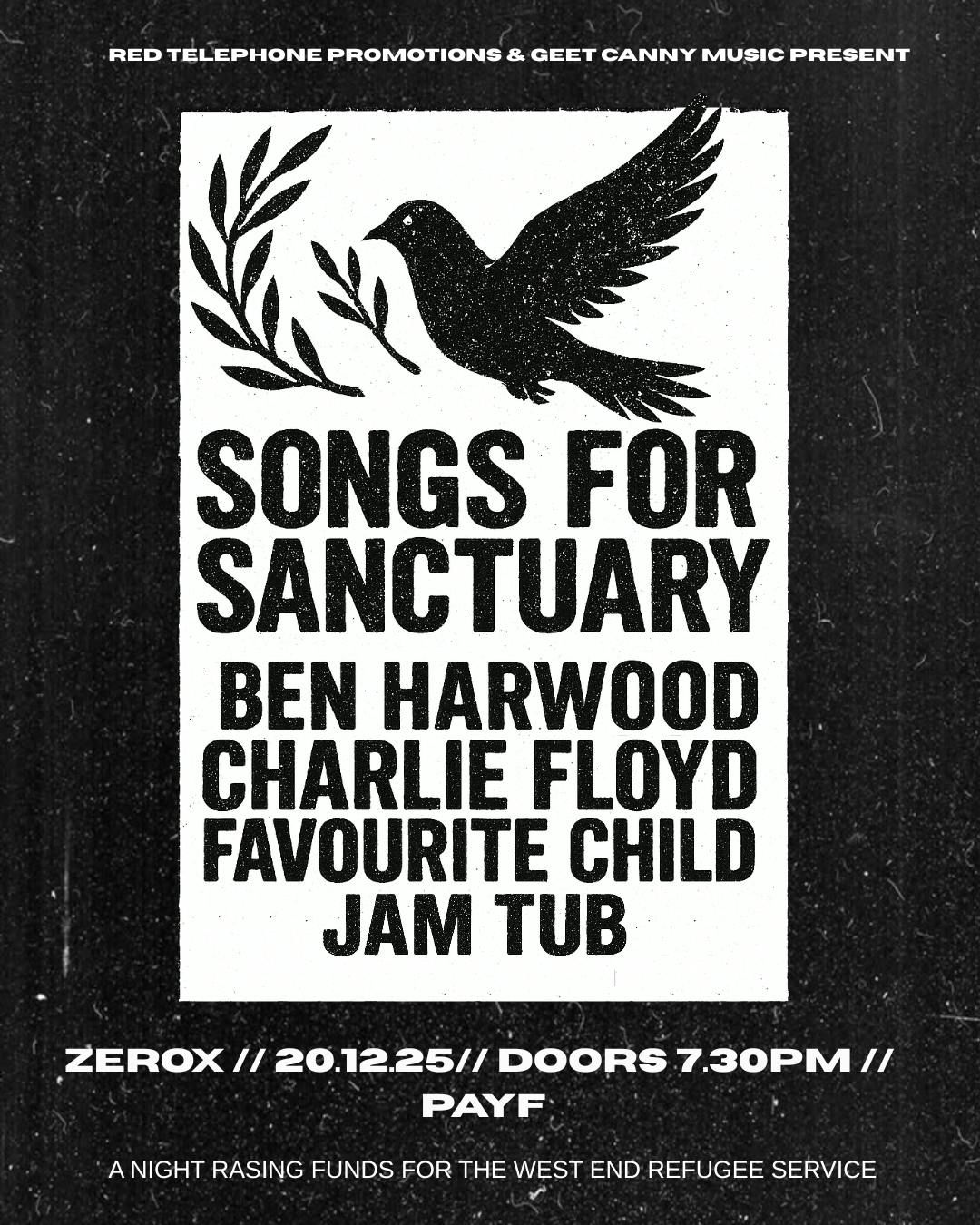 Red Telephone Promotions and Geet Canny Music present 'SONGS FOR SANCTUARY' at Zerox, Newcastle; a night raising funds for the West End Refugee Service (WERS). Bringing you an amazing lineup of local talent: Ben Harwood, Charlie Floyd, Jam Tub and Favourite Child. Make sure to come down to support the local music scene, and WERS