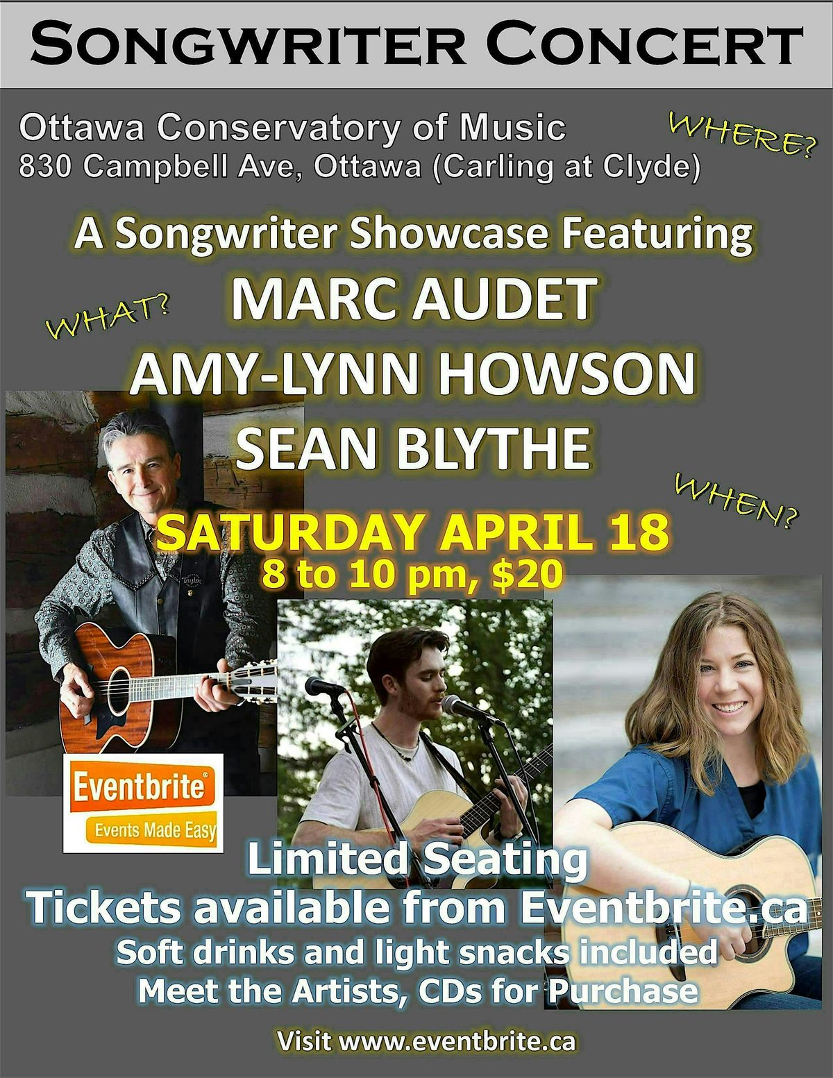 Hosted at the Ottawa Conservatory of Music, a special songwriter showcase is happening on Saturday April 18th(8 pm): SONGWRITER SHOWCASE Song Circle. Three songwriters will be presenting their songwriting in song circle style at the Ottawa Conservatory of Music (830 Campbell Ave., near Carling and Clyde). Folk songs from Marc Audet (), Sean Blythe () and Amy-Lynn Howson () will be performed along side songwriting insights and stage banter. The small 50 seat hall at OCM is the perfect quiet intimate setting for the sharing of songwriting. It'll be a great show, and perhaps the start of a series of songwriter showcases. Only 50 tickets are being sold (book your seats now!), but you can also take your chances with buying tickets at the door. Doors open at 7:30 pm and show starts at 8 pm. Meet the artists during intermission where soft drinks and snacks will be set out.