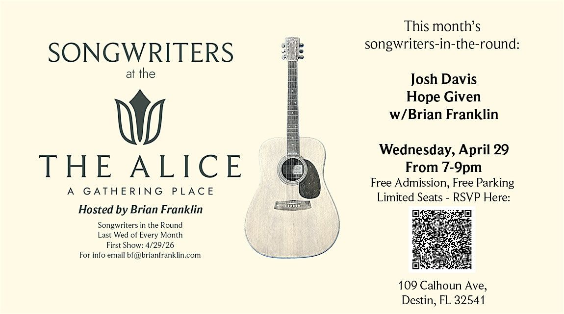 Ready for a bit of original, mostly-acoustic music? Songwriters at the Alice is a monthly songwriters-in-the-round hosted by singer/songwriter/guitarist and featuring monthly special guests—who are encouraged to accompany each other. The debut show on 4/29/26 will feature Brian, Outlaw-Country artist , and singer-songwriter .