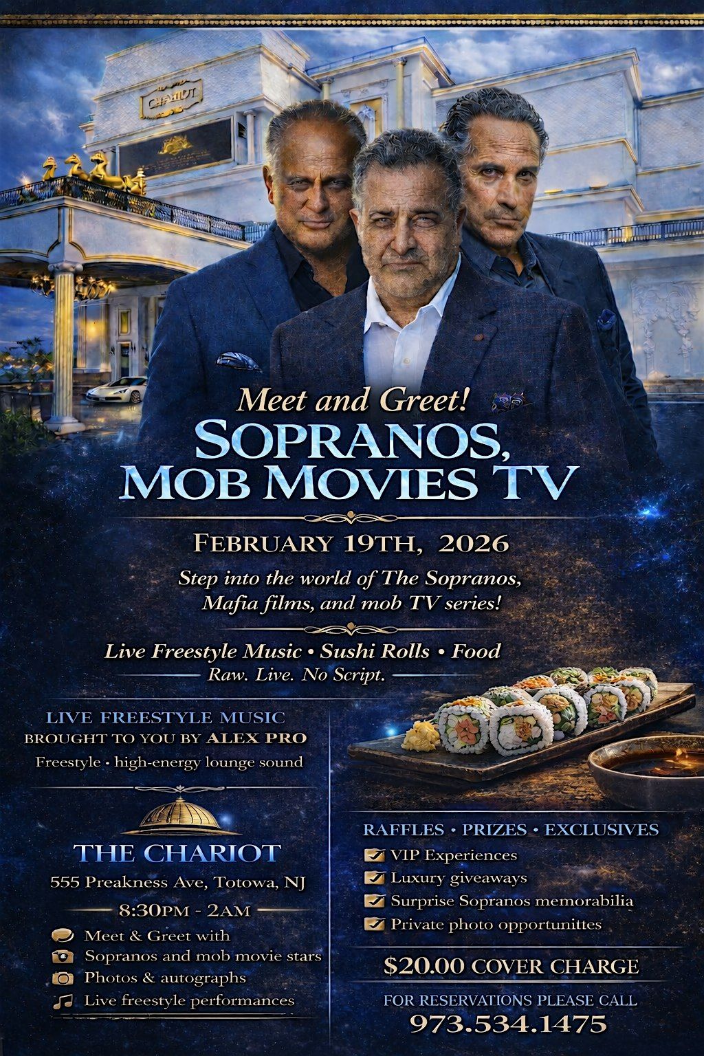 A night of freestyle music, 3 celebrities from your favorite mob movie or TV show. Artie Pasquale, Garry Pastore, Joey Catalano