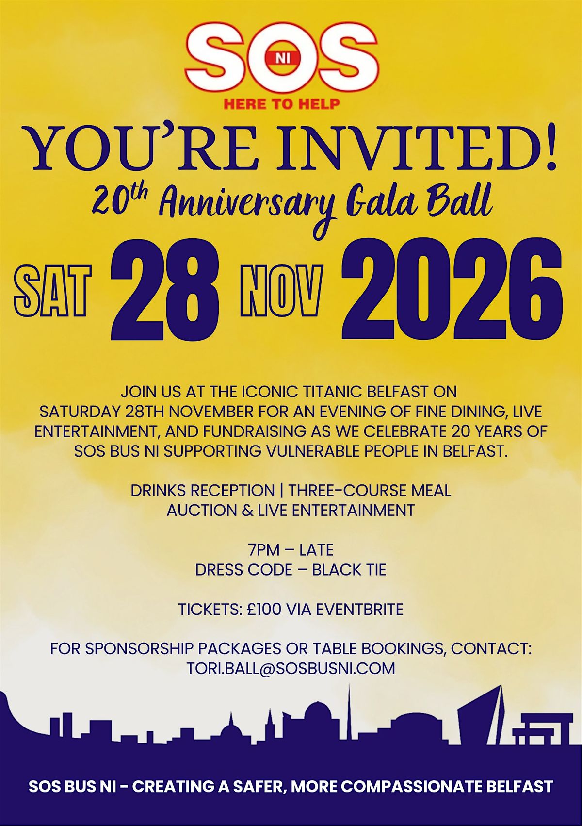 An evening of fine dining, live entertainment, and fundraising as we celebrate 20 years of SOS Bus supporting vulnerable people in Belfast.About this Event
