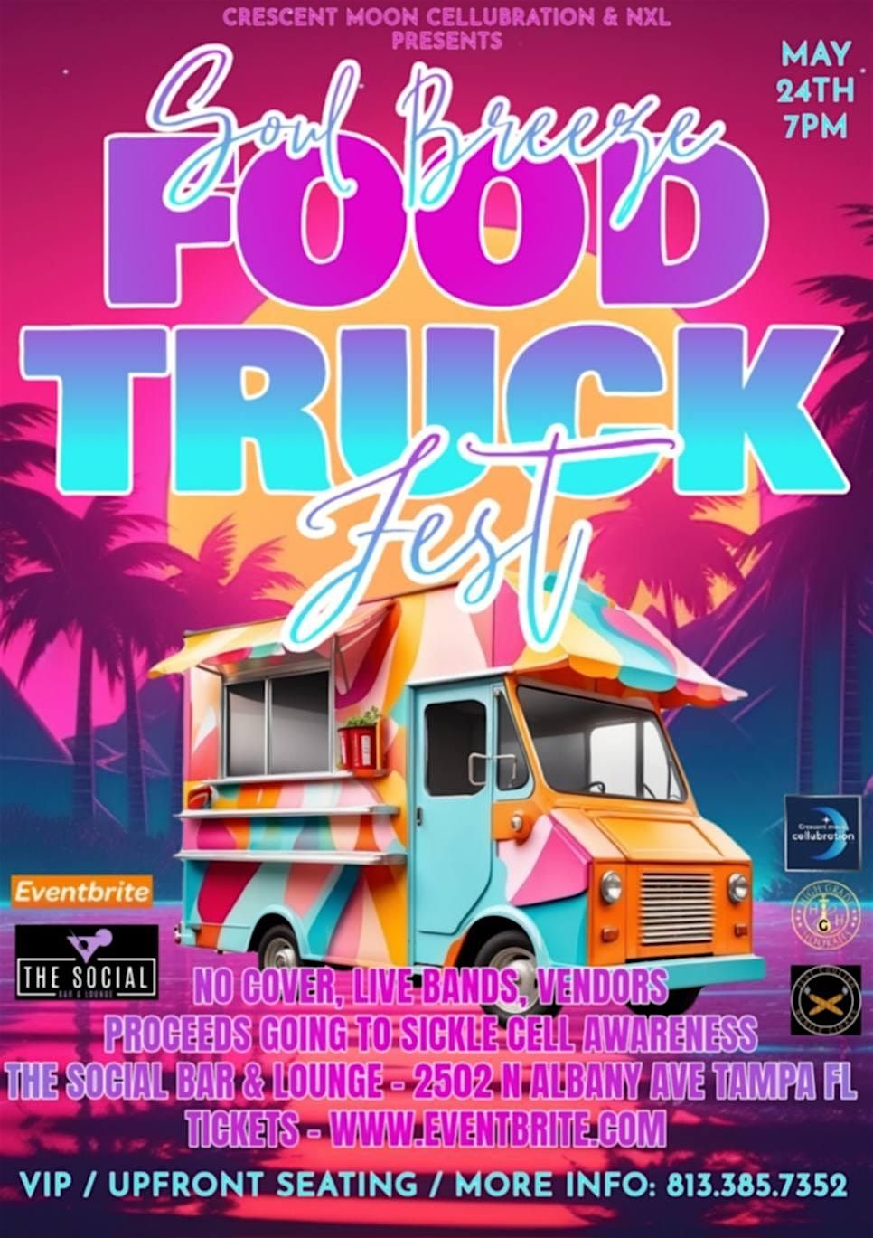 Soul Breeze Food Truck Fest, presented by Crescent Moon Cellubration & Next Level Entertainment, is an outdoor / indoor R&B, Jazz, Neo Soul FOOD TRUCK Music Festival taking place at The Social Bar & Lounge on Sunday, May 24th 2026. DOORS OPEN AT 7PM...SHOW STARTS AT 8PM. The festival / concert featuring some OUTSTANDING live r&b, jazz, and neo soul bands. We will have a few different and diverse eating options, gifts, raffles, give aways and local business vendors and more !!! The ONLY place to be Memorial day weekend May 24th is at THE SOCIAL BAR & LOUNGE- 2502 NORTH ALBANY AVE TAMPA FL !! FREE YOUR mind to a great night out and a GUARANTEED grown folk good time !! It is URGENT that YOU get YOUR tickets NOW !! YOU will LOVE this atmosphere full of SEXY and mature adults. This will EASILY be the move that YOU cant miss . PROVEN every year to pump out awesome RESULTS with our big & classy turnouts !! THIS EVENT IS INDOORS & OUT DOOR SO SANDALS, TENNIS SHOES OR GET FLY AND ROCK YOUR HARD BOTTEMS. Proceeds & donations from this event will go to Crescent Moon Cellubration Inc non profit to help with sickle cell awareness in the community. Seats are limited so you may want to purchase a VIP reserved seat. GET YOUR TICKETS NOW !!!