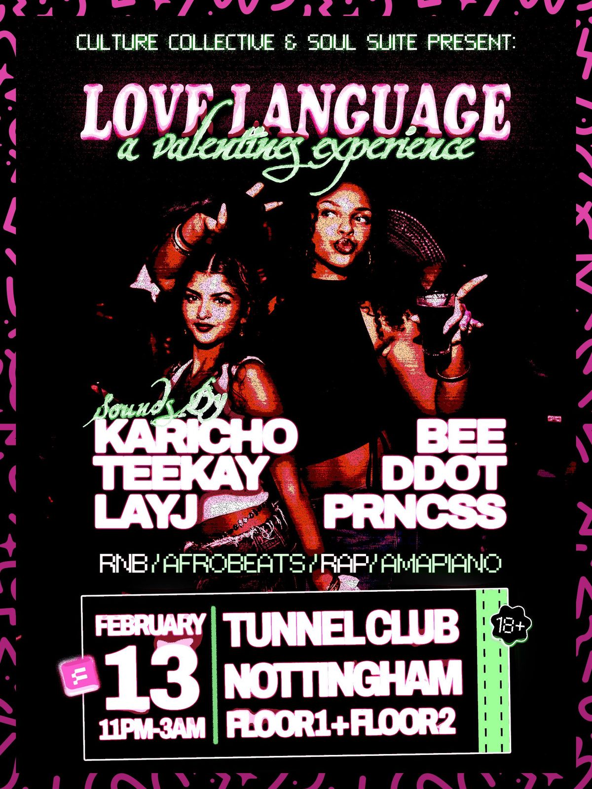 💌 LOVE LANGUAGE: A VALENTINES EXPERIENCECulture Collective x Soul SuiteTunnel Club, Nottingham.Two Floors. One Night. This Valentine’s, Culture Collective & Soul Suite collab to bring you Love Language - a curated valentines experience. Don’t miss out.MUSIC POLICYFLOOR 1:RnB, UK Rap, Trap & Old SchoolFLOOR 2:Afrobeats, Amapiano & Afrohouse WHAT TO EXPECT…- Valentine’s themed experience- All star DJ lineup- Tooth Gems available on the night by Diamz+ more to be announcedLAST ENTRY 23:30Disclaimer: