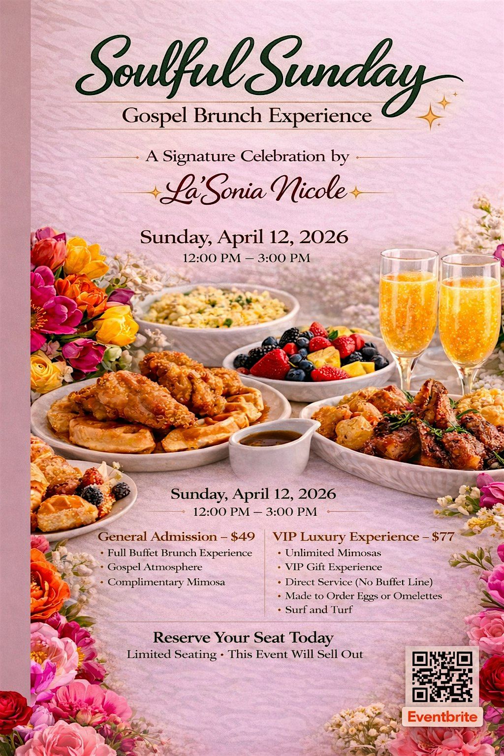 Join us for a one-of-a-kind Soulful Sunday Gospel Brunch Experience—a luxurious afternoon designed to nourish your spirit, indulge your taste buds, and celebrate life in an atmosphere of joy, elegance, and connection.