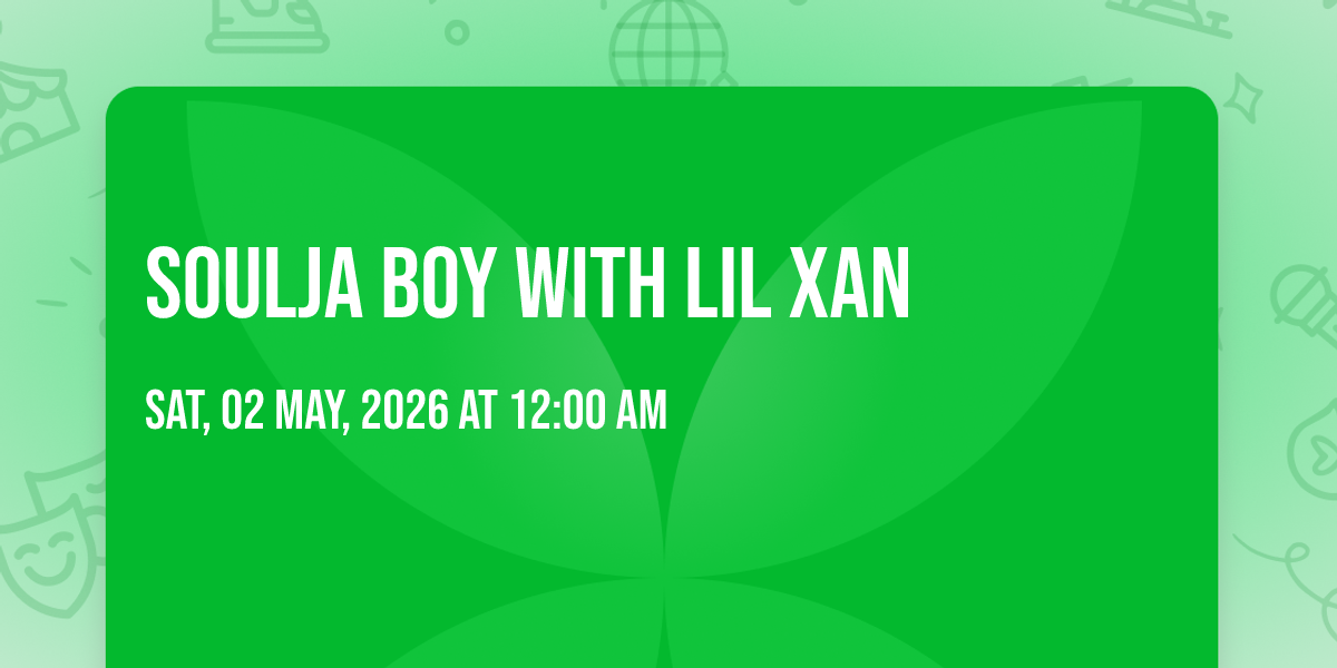 π Location: 32.7885, -79.9369β¨ Discover the extraordinary at Soulja Boy with Lil Xan, where magic meets reality in ways you've never imagined! ποΈ Set in Charleston Music Hall nestled in bustling Charleston, SC, this event promises to be a landmark occasion. π Taking place on May 2nd, 2026 at 12:00 AM, it's going to create an atmosphere where every moment becomes a cherished memory. π Immerse yourself in an experience crafted with attention to every detail, designed to surprise and delight at every turn. They have worked tirelessly to ensure this event exceeds all expectations, bringing together elements of entertainment, innovation, and pure joy. π Don't miss your chance to be part of this remarkable journey!