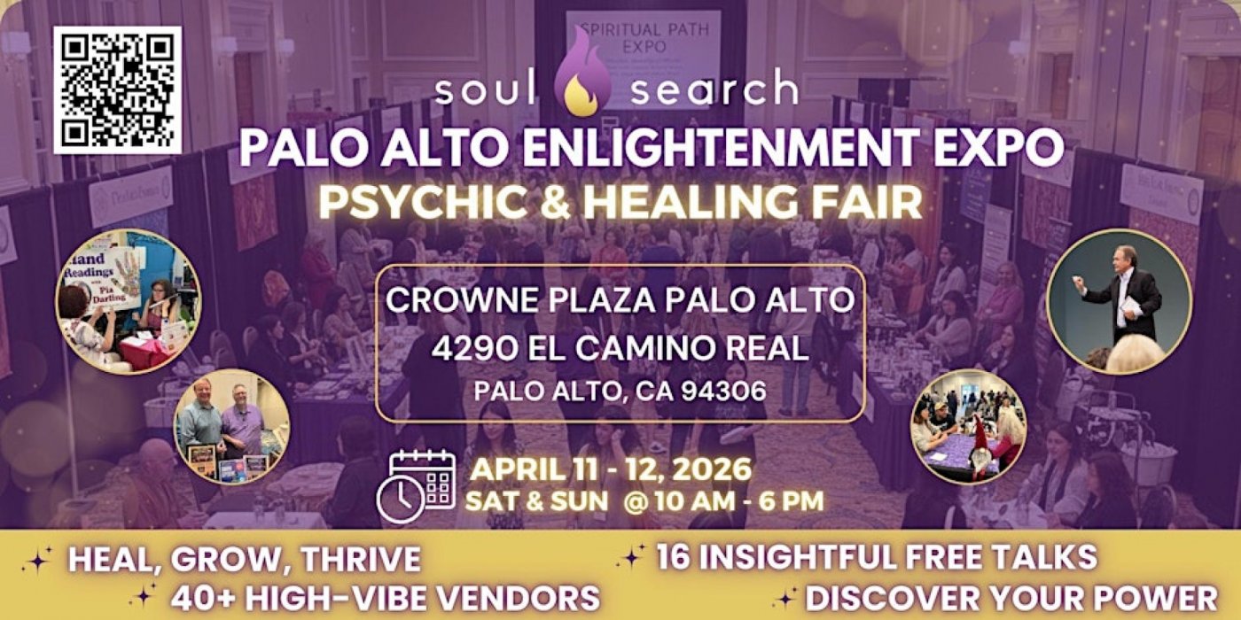 Join us for our 2-day Enlightenment Expo, Saturday–Sunday, April 11 – 12, 2026. Enjoy transformational talks and workshops all weekend. Meet energy healers, spiritual guides, mediums, psychics, astrologers, intuitive artists, holistic health experts, and more at the SoulSearch Palo Alto Enlightenment Expo & Psychic & Healing Fair!