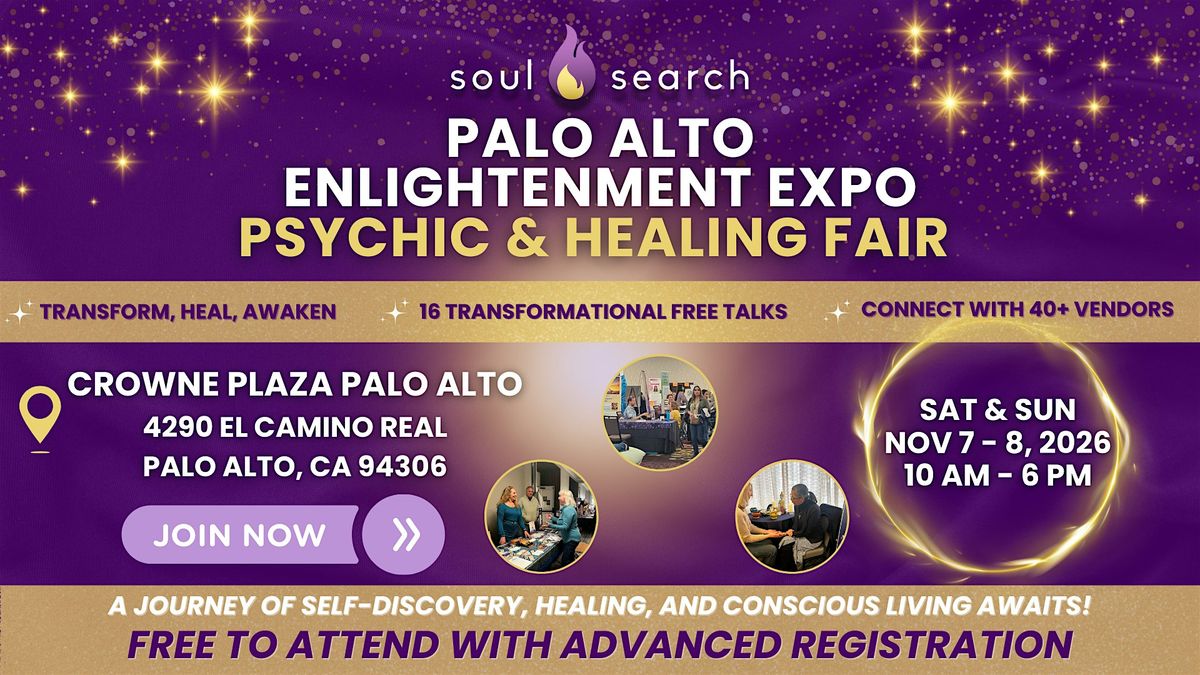 Join us for our 2-day Enlightenment Expo, Saturday–Sunday, November 7 – 8, 2026. Enjoy transformational talks and workshops all weekend. Meet energy healers, spiritual guides, mediums, psychics, astrologers, intuitive artists, holistic health experts, and more at the SoulSearch Palo Alto Enlightenment Expo & Psychic & Healing Fair!
