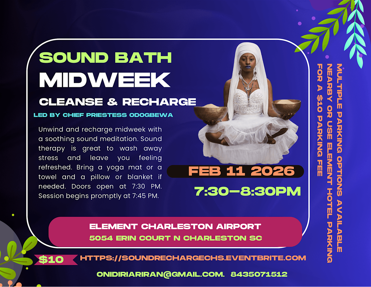 Join Chief Priestess Odogbewa for an in person soothing sound bath session, designed to help you cleanse your mind and recharge your energy midweek. Let the gentle waves of sound wash away stress and leave you feeling refreshed. Perfect for anyone needing a little reset! Bring yoga mat or towel and a pillow if needed. Please come with an open mind, and get ready to relax like never before.
