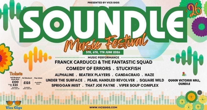 Soundle 26 is set!!!June 5-7 2026Queen Victoria Hall OundleThe next Soundle features the headliners as follows:Stuckfish on Friday - Comedy Of Errors on Saturday - Franck Carducci & The Fantastic Squad on SundayThese will be joined by Under The Surface, Alphaline, Spriggan Mist, Haze, Viper Soup Complex, Pearl Handled Revolver, Beatrix Players, Candacraig, Square Wild and That Joe PayneDisclaimer: