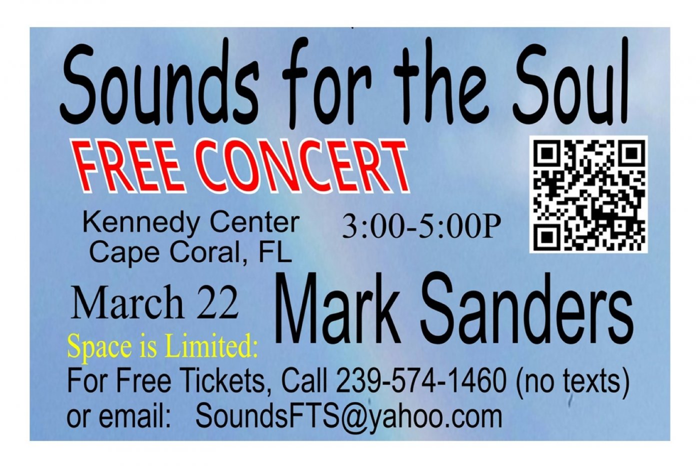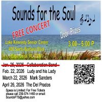 Sounds for the Soul will present our 3rd FREE concert this season on March 22, 2026 at the Lake Kennedy Center in Cape Coral, FL. This month we will feature Mark Sanders, a well know local and national singer who has appeared on Broadway as well as Las Vegas. Now he is here with us in Cape Coral. If you missed our first 2 concerts with the Collaboration Band and Ludy and his Lady, you have a chance to make up for it on March 22. All of our concerts are FREE and there is a door prize or two thrown in. Seating is limited since it is an indoor event. You must call 239-574-1460 and leave a message or email us at [email protected]. If you want more information on Mark Sanders, visit our web page at www.Sounds-forthesoul.com.