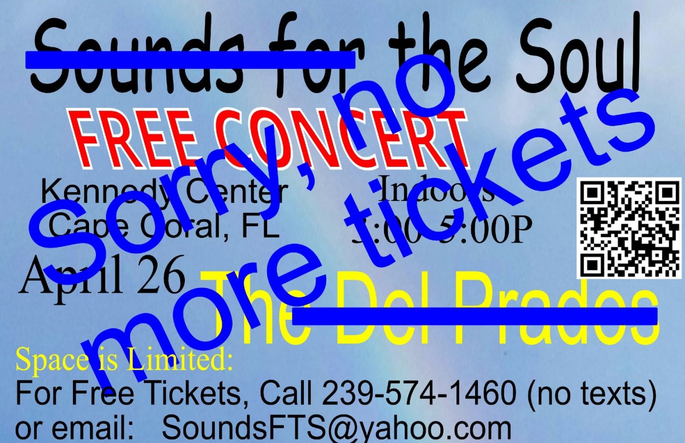 Our last concert this year brings the Del Prados to the Kennedy Center. Most of you living in Cape Coral are aware of and have heard the Del Prados perform locally. This is your chance to hear them perform for FREE on Sunday April 26 at 3:00PM. This will be a sellout event. The Kennedy Center will hold about 140 folks so tickets will be limited and will be required. So, plan to join us on Sunday, April 26 at the Kennedy Center. The concert starts promptly at 3:00PM. Tickets will be limited for this event. You must call 239-574-1460 and leave a message (no text messages) or email us at [email protected].