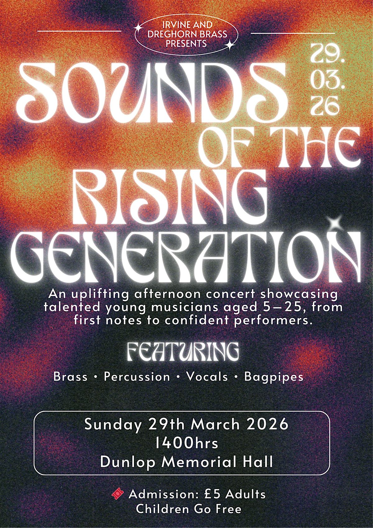 BRASS β’ PERCUSSION β’ VOCALS β’ BAGPIPESAn uplifting afternoon concert showcasing talented young musicians aged 5β25.