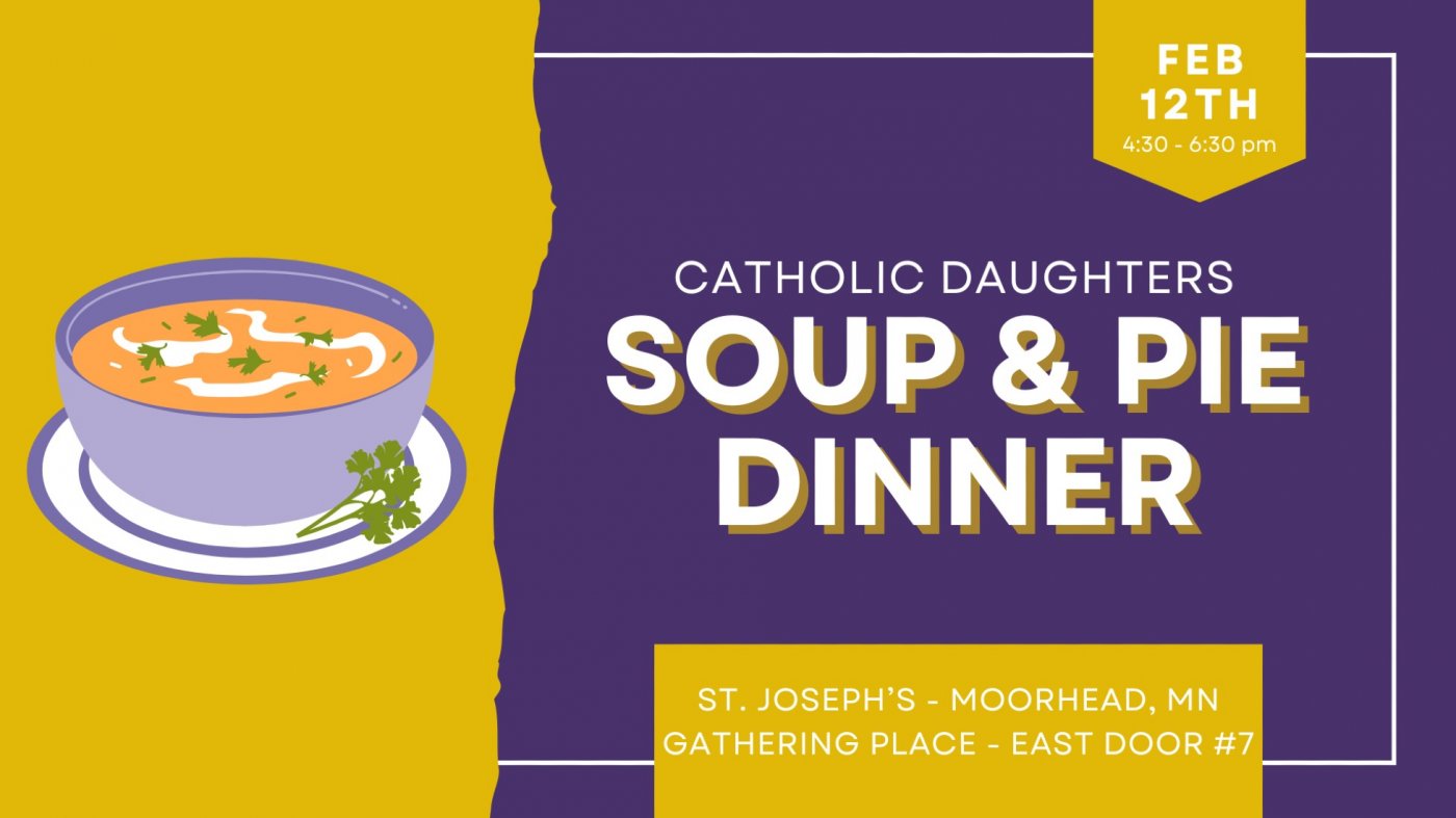 SOUP AND PIE DINNER: The annual Catholic Daughter Soup and Pie Dinner is scheduled for Thursday, February 12 from 4:30 ‐ 6:30 p.m. in The Gathering Place at St. Joe's (door #7) - 218 10th St S, Moorhead, MN 56560. Homemade soup and pie served with fresh baked popovers lovingly made by members of the Catholic Daughters of America Court St. Mary. It’s a fast and friendly dinner—perfect for a Thursday evening! Tickets are $12 for adults, $8 for children 5‐10, and can be purchased at the door during the event.