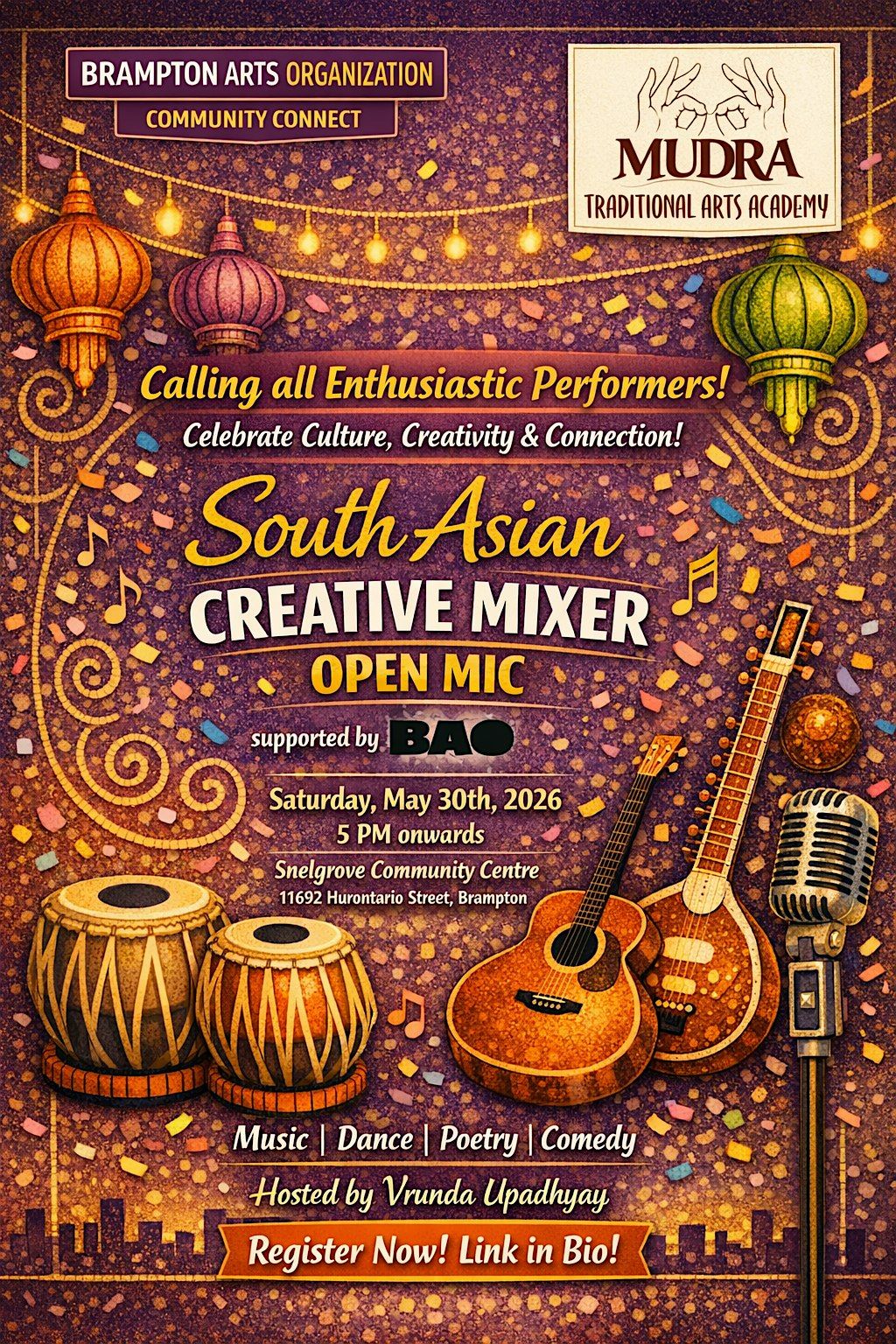 Join us in person for the South Asian Creative Mixer hosted by Vrunda Upadhyay, produced with the support of the BAO for the Brampton Arts Organization Community Connect 2026 Program. It’s a fantastic chance to connect, collaborate, and celebrate the vibrant South Asian creative community. Whether you’re a Dancer, Singer, Musician, Poet, Comedian or just love creativity, come hang out, share ideas, and get inspired. Don’t miss this fun and inspiring mixer!