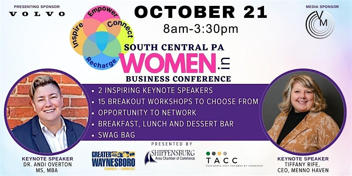 This conference, presented in partnership with the Shippensburg Area Chamber of Commerce, Tuscarora Area Chamber of Commerce, and Greater Waynesboro Chamber of Commerce, is designed to bring professional women together for a day of growth and connection. Enjoy two inspiring keynote speakers, 15 breakout sessions, networking opportunities, and plenty of great food—including breakfast, lunch, dessert, and a swag bag to take home!