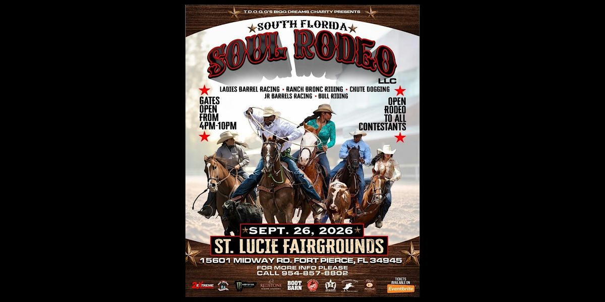 Welcome to the South Florida Soul Rodeo - Ft. Pierce ! Get ready for a day filled with thrilling rodeo action, live music, delicious food, and family fun at the St. Lucie County Fairgrounds Join us for an unforgettable experience celebrating the spirit of the South Florida community. Whether you're a rodeo enthusiast or just looking for a good time, this event has something for everyone. Don't miss out on the excitement - mark your calendars and round up your friends and family for a day of soulful entertainment!