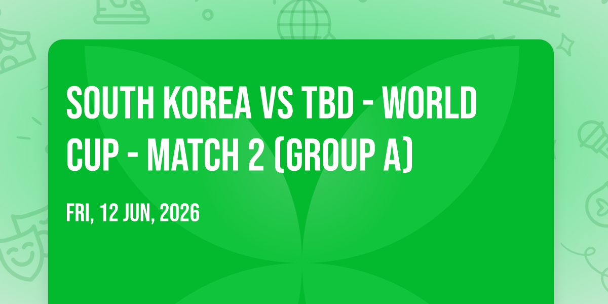 π Location: 20.682, -103.465π Step into a world of wonder at South Korea vs TBD - World Cup - Match 2 (Group A), where extraordinary moments await! ποΈ Located at Estadio Akron in dynamic Guadalajara, JA, this event will become the talk of the town. π Join us on June 12th, 2026 at 03:00 AM for a celebration that defies the ordinary. β¨ This curated experience brings together the best of entertainment, culture, and community spirit. Every detail has been thoughtfully planned to ensure an unforgettable experience for all our guests. π― Take advantage of this opportunity to be part of something special. π Early registration is recommended as space is limited!