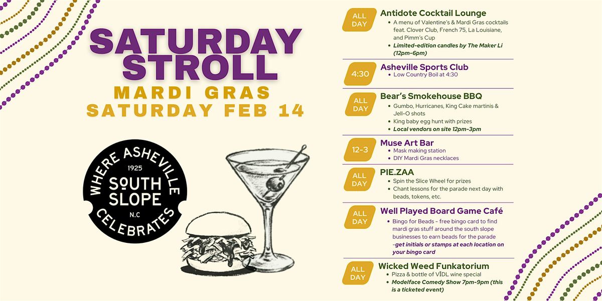 Guests are invited to stroll between South Slope spots while enjoying Mardi Gras–themed cocktails, food specials, interactive art activities, games, and pop-up experiences. Local vendors and artists will be on site throughout the district creating a walkable celebration that’s perfect for couples, friends, and groups looking to kick off the weekend!