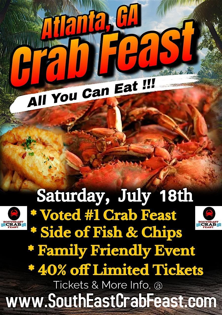 ALL YOU CAN EAT BLUE CRABS!!!! Please join us for the SouthEast Crab Feast event in Atlanta, GA on Saturday, July 18th. This event offers the Low Country Coastal Heritage of outdoor cooking of fresh seafood. This highly anticipated event will offer ALL YOU CAN EAT fresh Blue Crabs, one side of Fish & Chips, Music and a Family Friendly Environment for the entire family.
