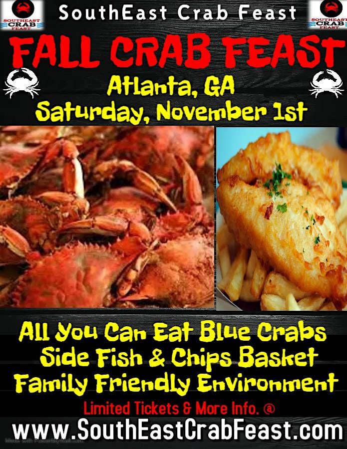 ALL YOU CAN EAT BLUE CRABS!!!! Please join us for the SouthEast Crab Feast event in Atlanta, GA on Saturday, November 1st. This event offers the Low Country Coastal Heritage of outdoor cooking of fresh seafood. This highly anticipated event will offer ALL YOU CAN EAT fresh Blue Crabs, one side of Fish & Chips, Music and a Family Friendly Environment for the entire family.