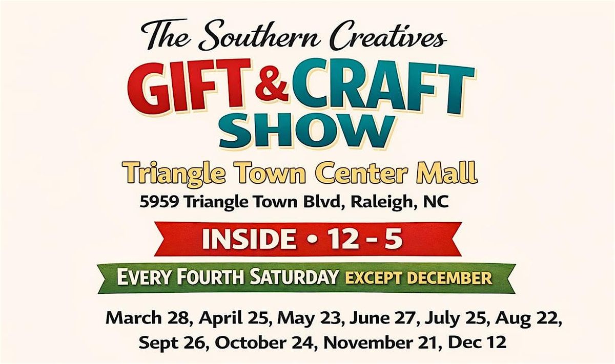 ποΈ SOUTHERN CREATIVES Gift & Craft Show Market π SHOP LOCAL β’ SHOP HANDMADE π π Triangle Town Center Lower Level Near Macyβs ποΈ Starting at Saturday, March 28, 2026 - Every 4th Saturday π 12 PM β 5 PM β¨οΈ INDOOR EVENT β¨ Shop talented local artists & makers πΌοΈ Art π Clothing π―οΈ Handmade Goods πͺ Baked Treats π The perfect place to find unique gifts & support small businesses! π Family Friendly πΈ Fresh vendors every 4th Saturday